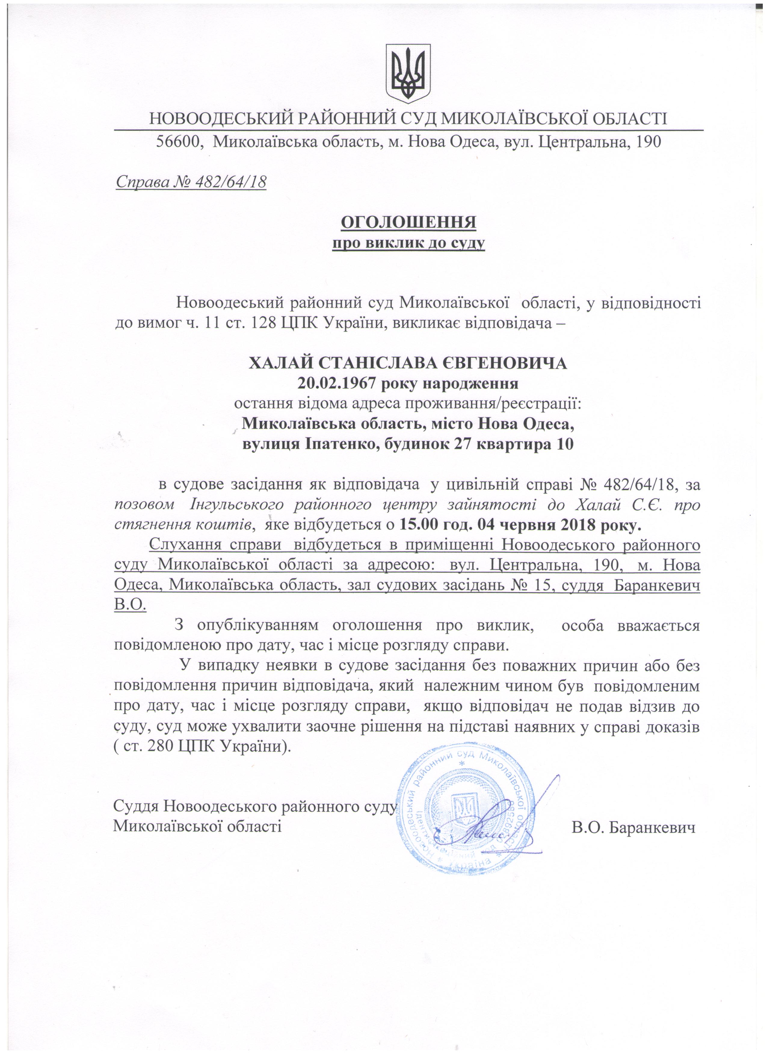 Оголошення про виклик до суду Халай Станіслава Євгеновича по справі 482/64/18