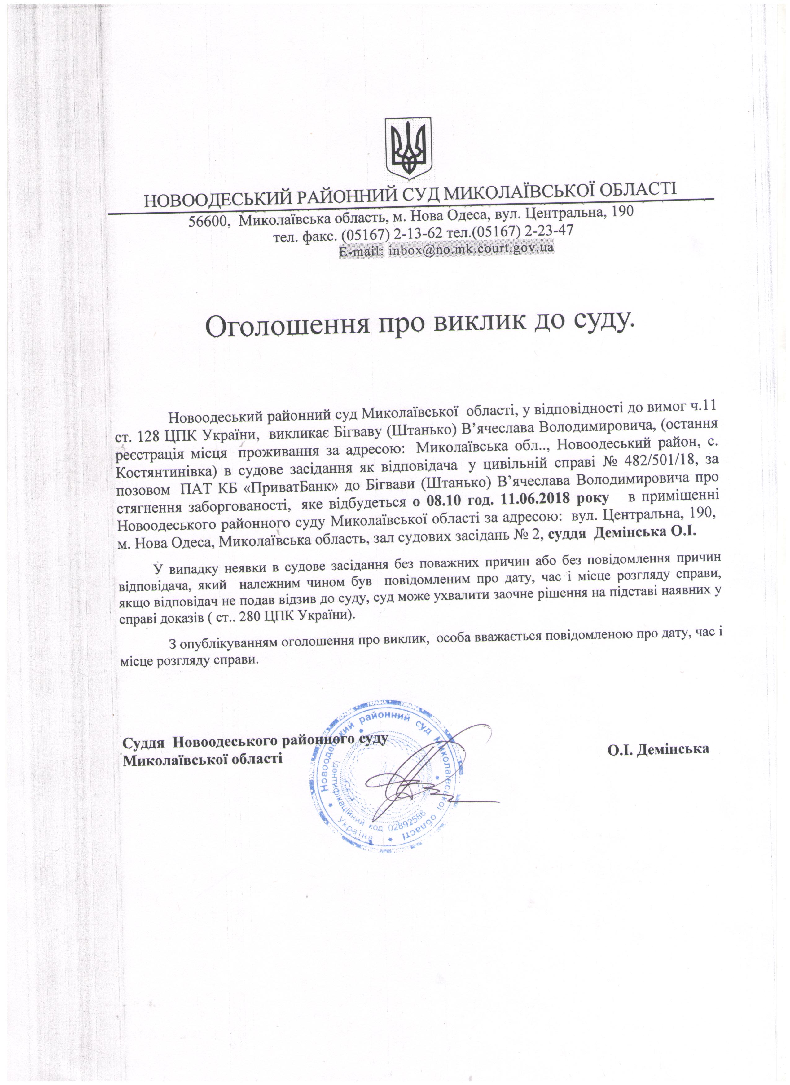 Оголошення про виклик до суду Бігваву(Штанько) В’ячеслава Володимировича по справі 482/501/18