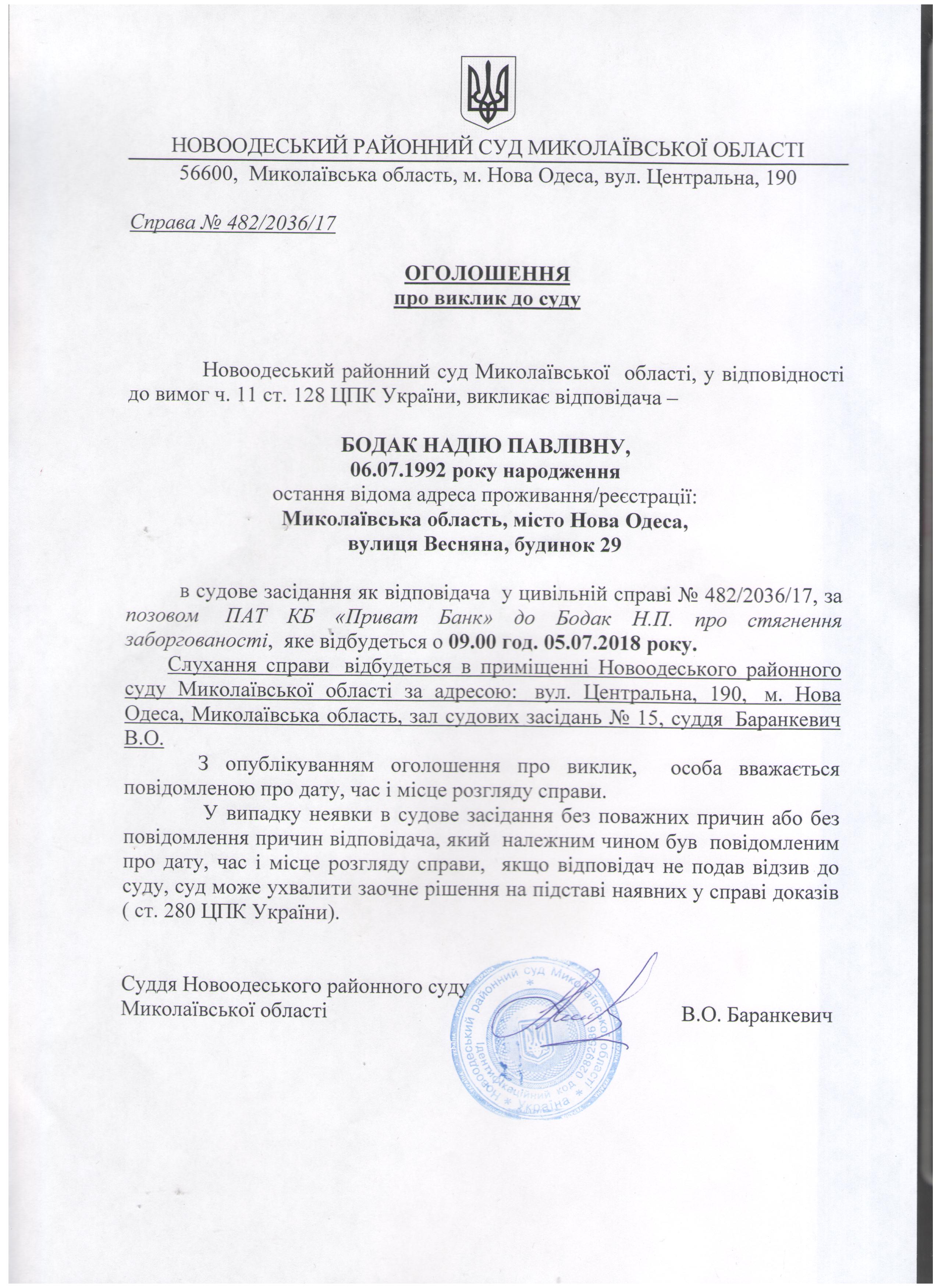 Оголошення про виклик до суду Бодак Надію Павлівну по справі 482/2036/17