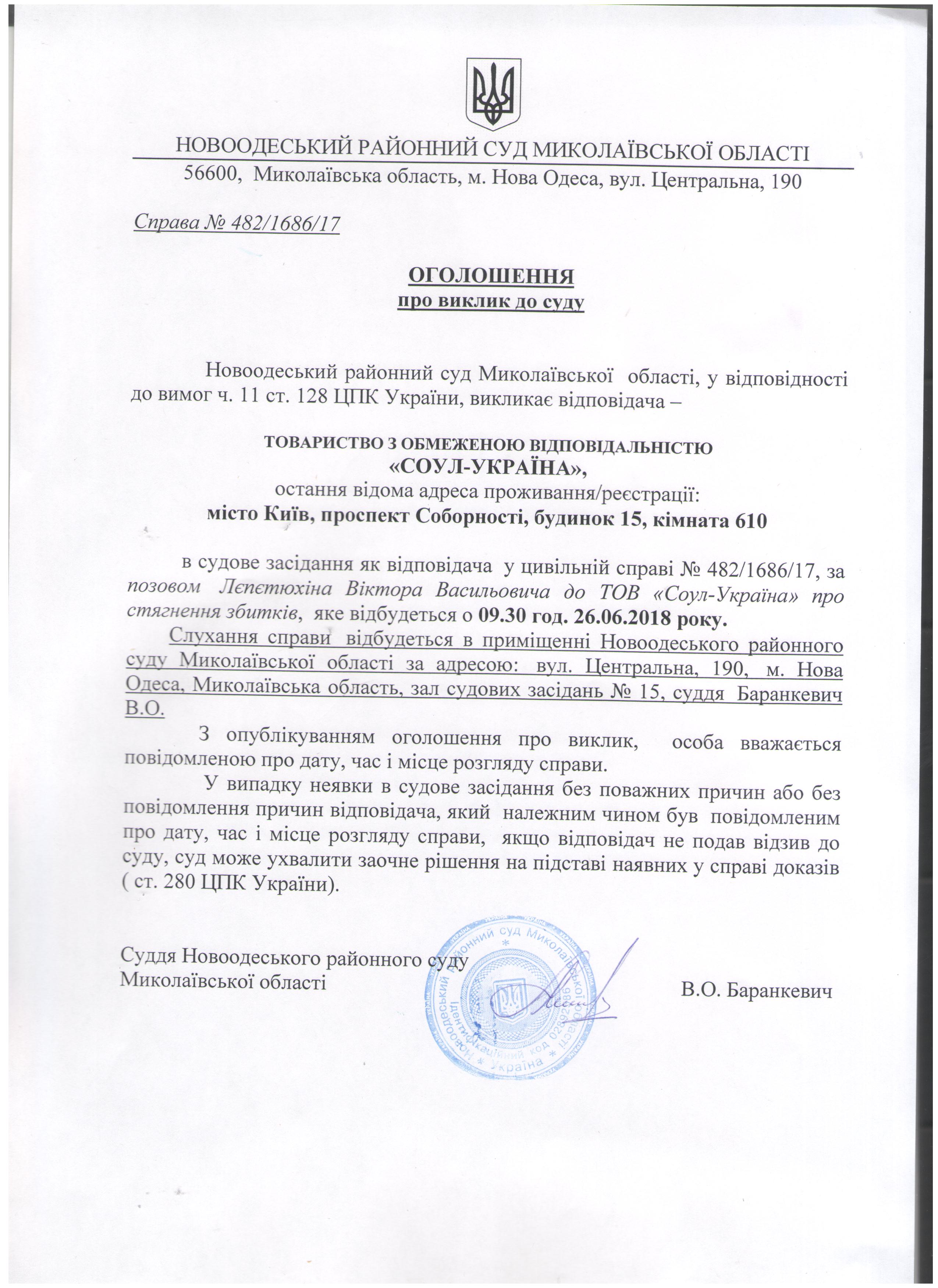 Оголошення про виклик до суду ТОВ "СОУЛ-УКРАЇНА" по справі 482/1686/17