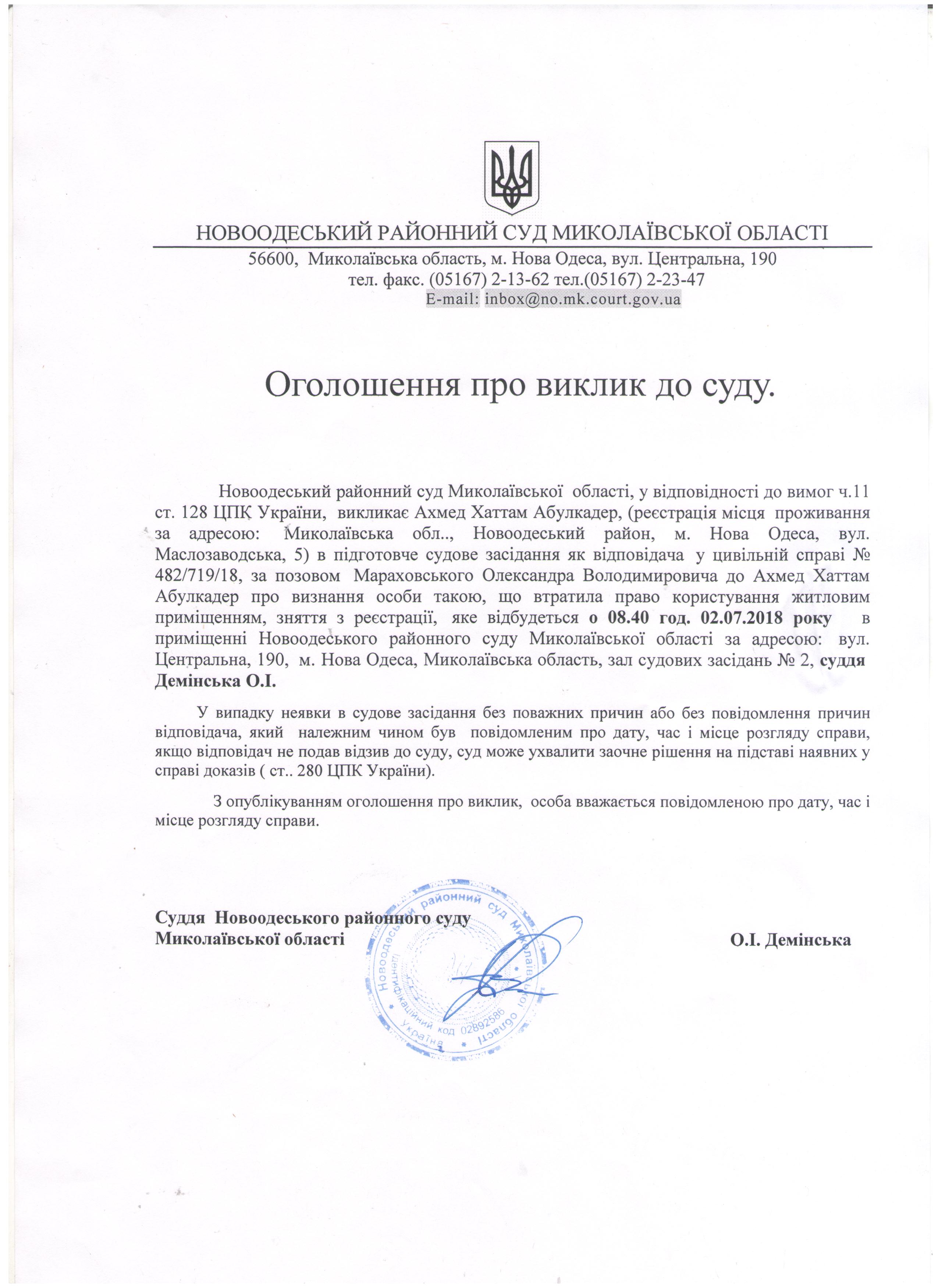 Оголошення про виклик до суду Ахмед Хаттам Абулкадер по справі 482/719/18