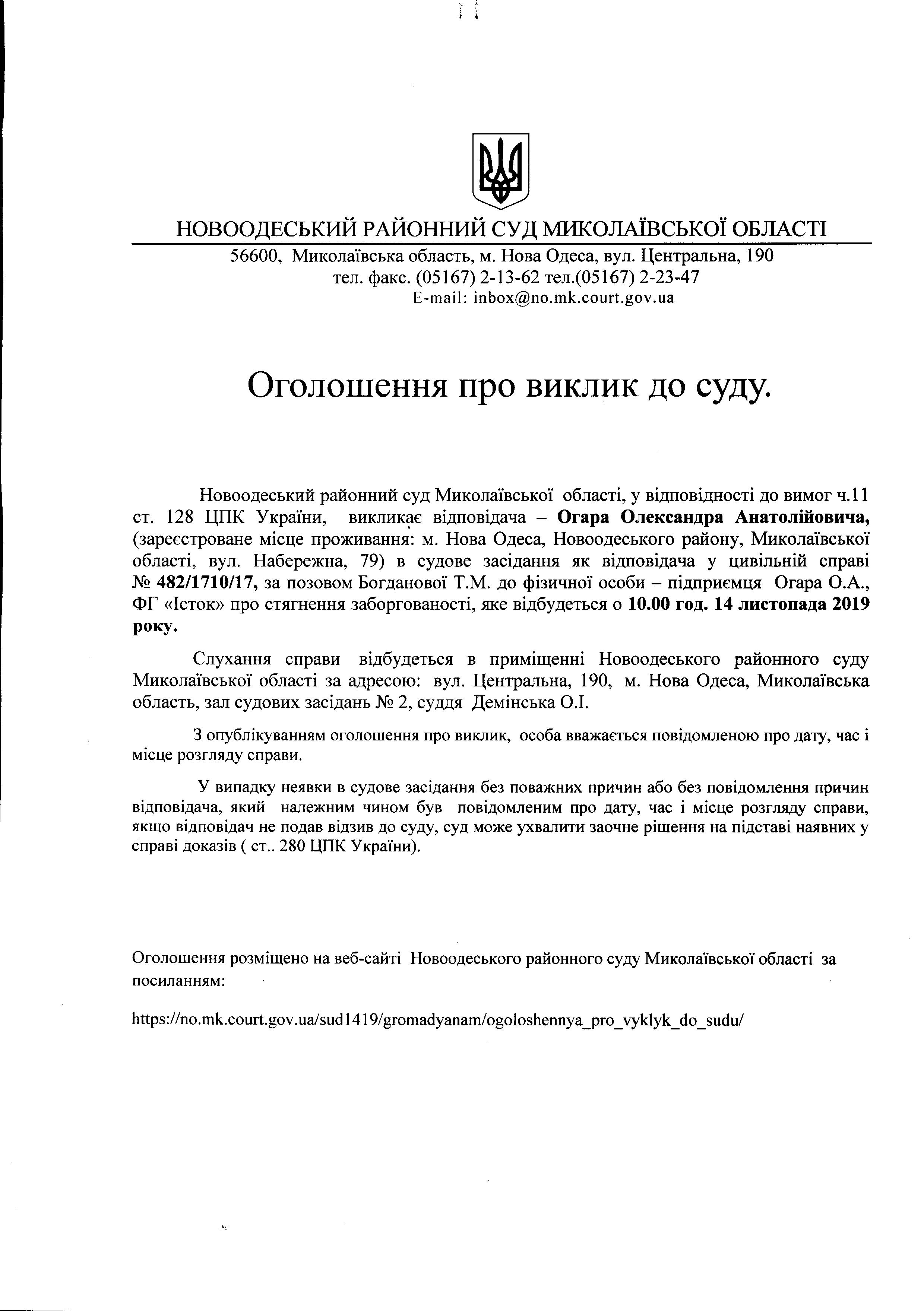 Оголошення про виклик до суду Огара Олександра Анатолійовича по справі 482/1710/17