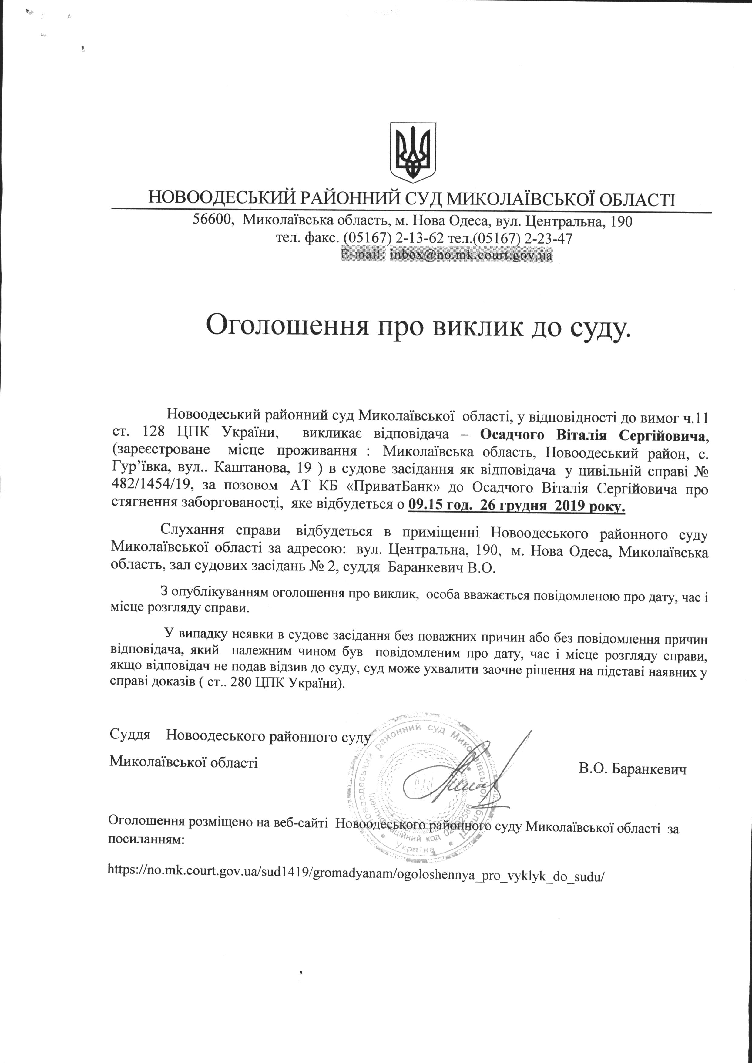 Оголошення про виклик до суду Осадчого Віталія Сергійовича по справі 482/1454/19