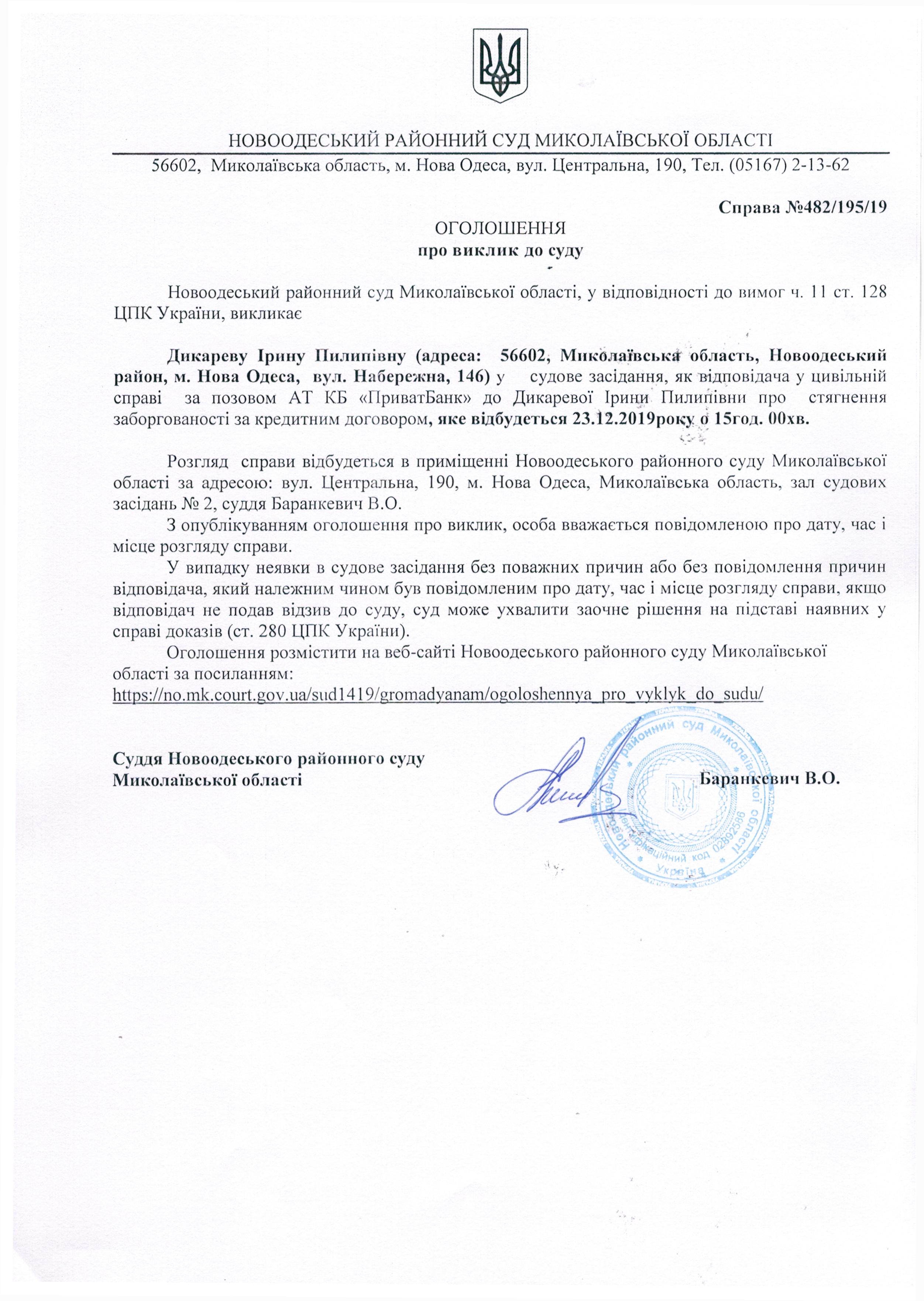 Оголошення про виклик до суду Дикареву Ірину Пилипівну по справі 482/195/19