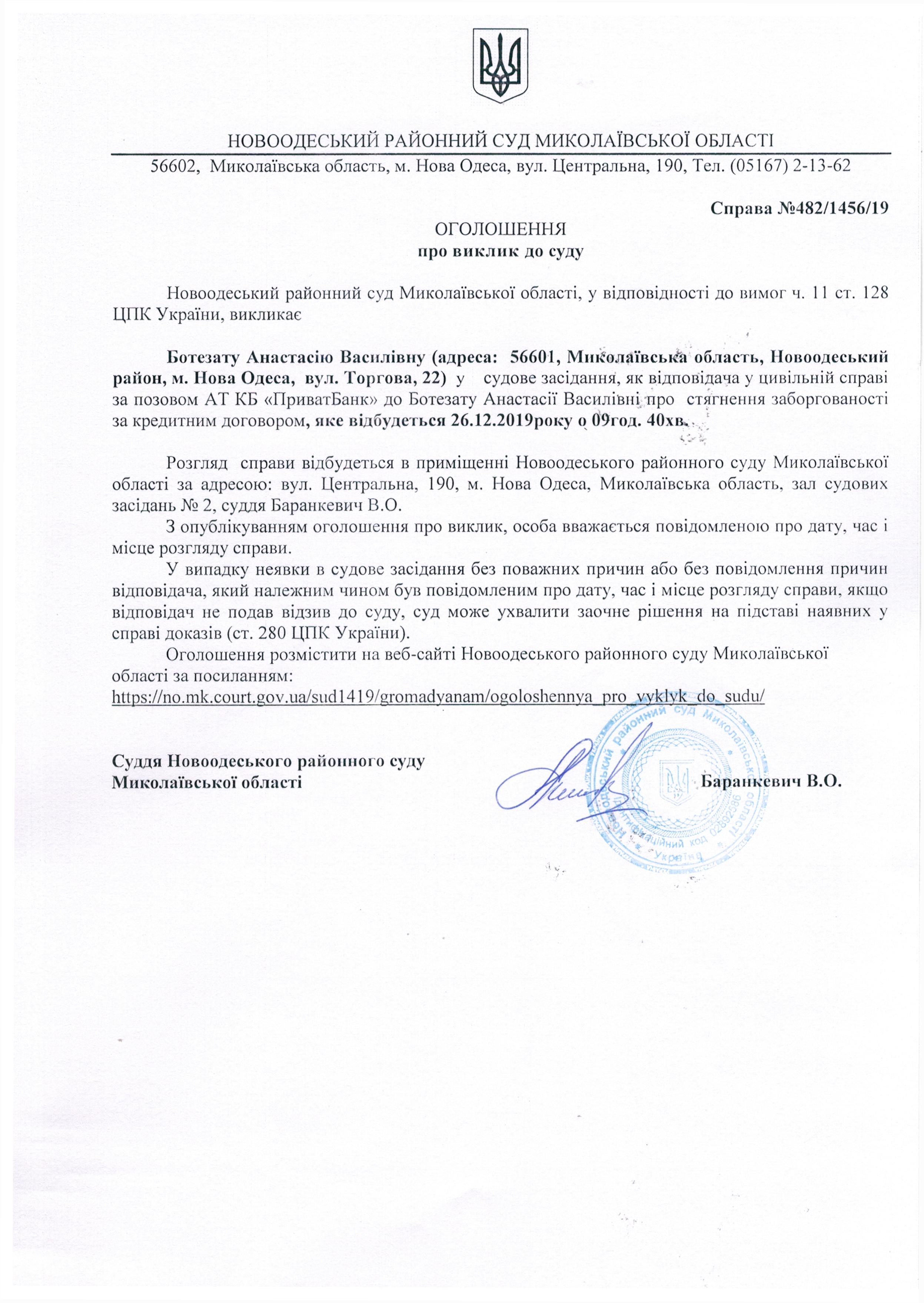 Оголошення про виклик до суду Ботезату Анастасію Василівну по справі 482/1456/19