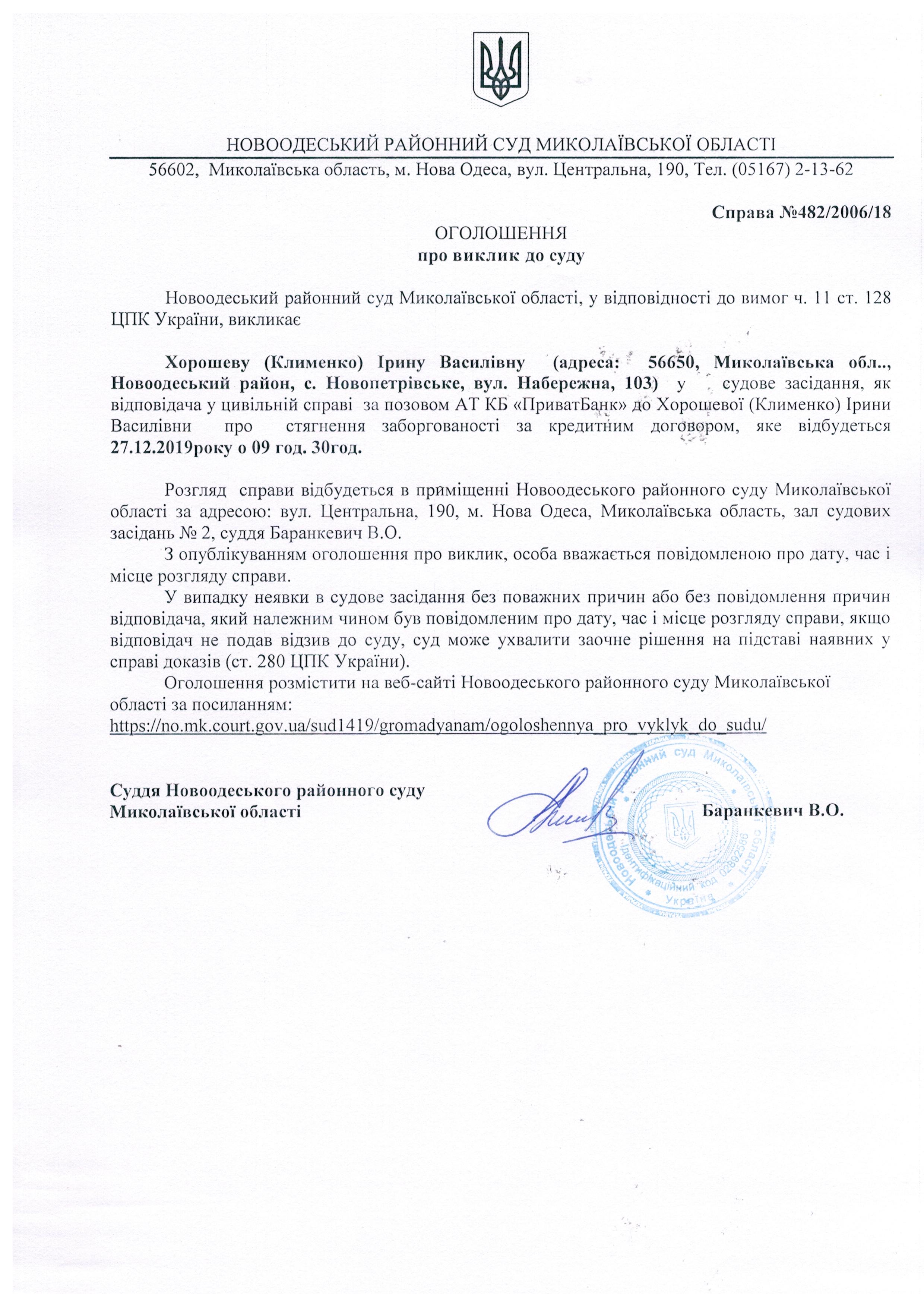 Оголошення про виклик до суду Хорошеву(Клименко) Ірину Василівну по справі 482/2006/18