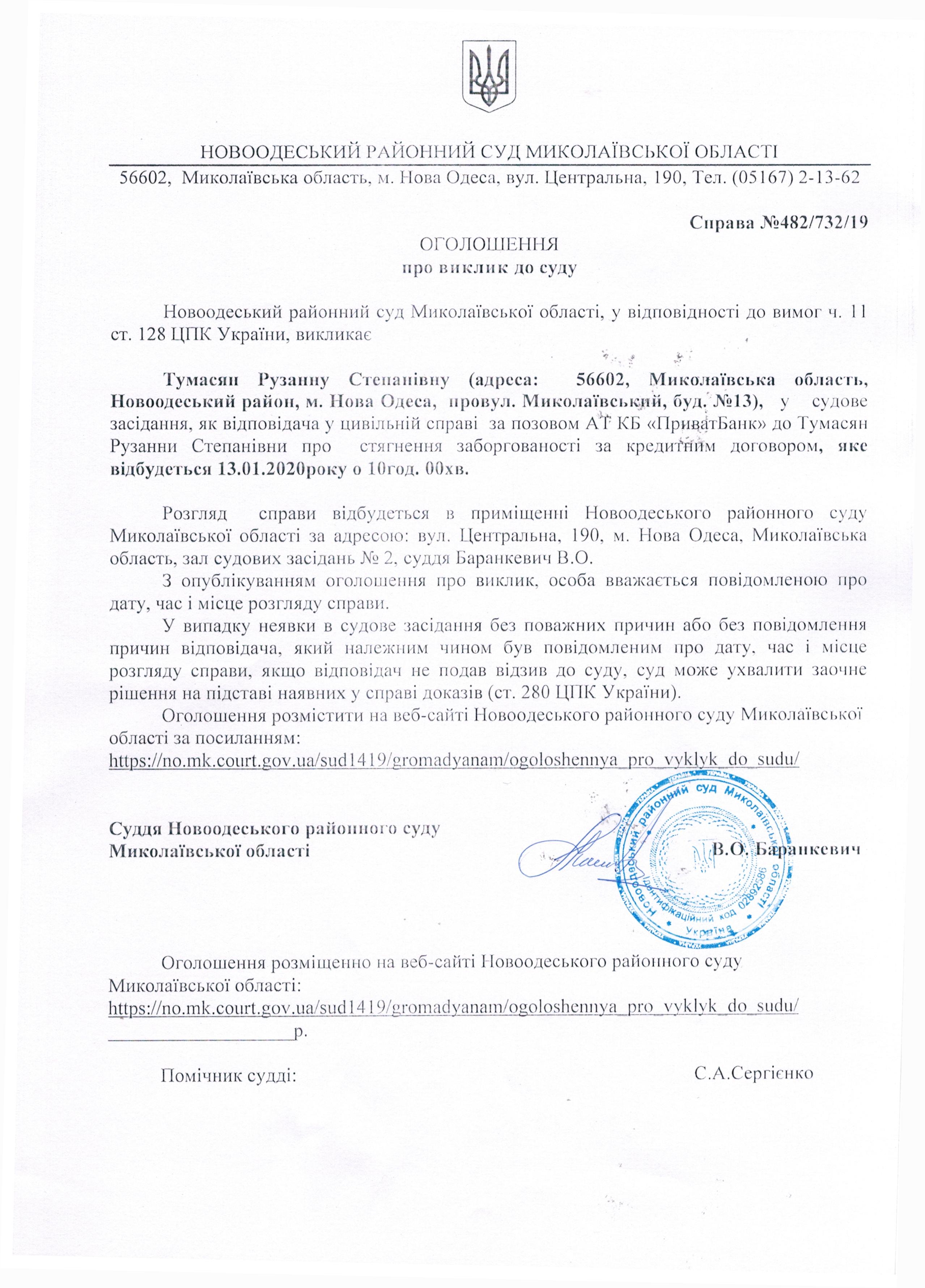 Оголошення про виклик до суду Тумасян Рузанну Степанівану по справі 482/732/19
