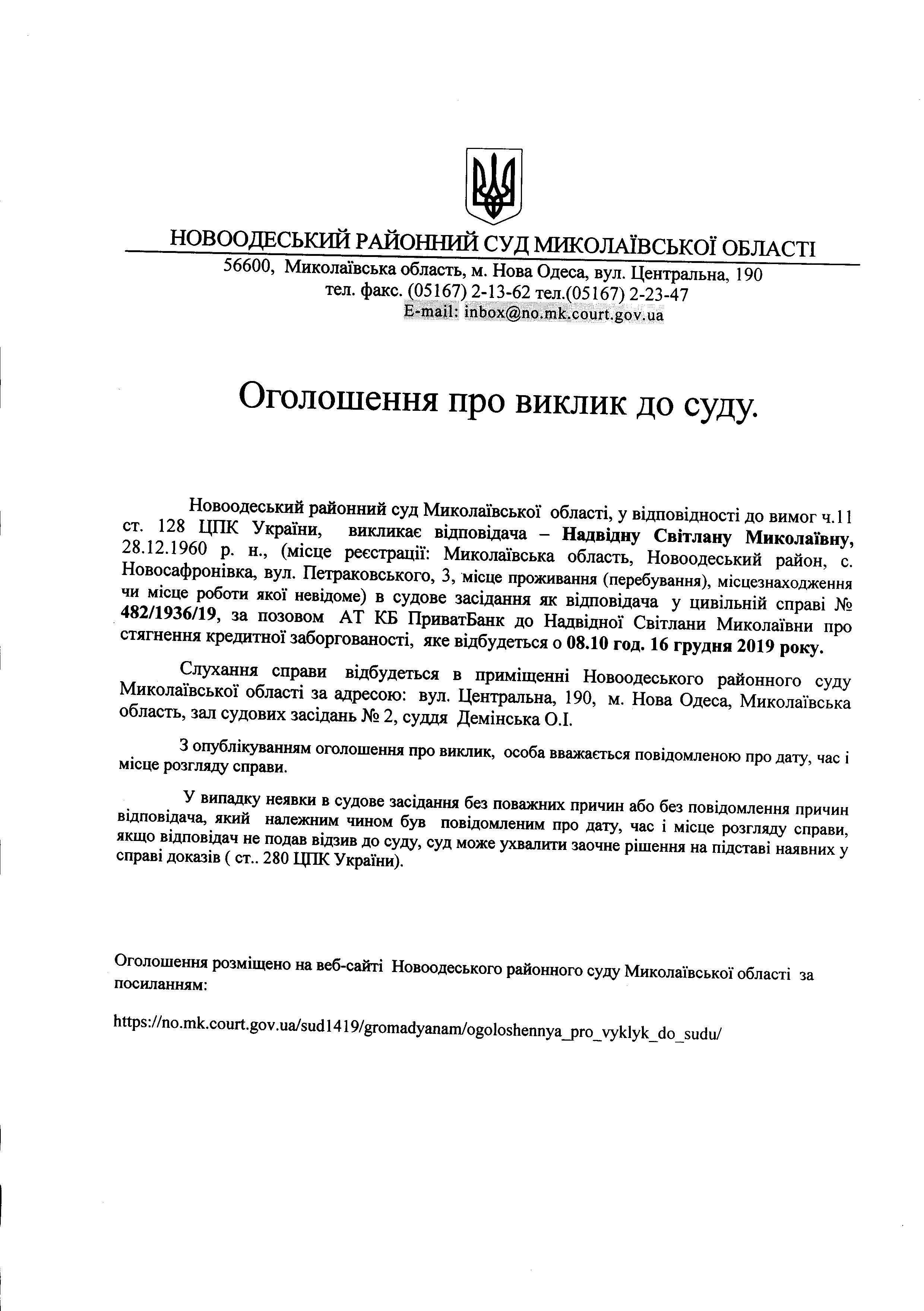 Оголошення про виклик до суду Надвідну Світлану Миколаївну по справі 482/1936/19