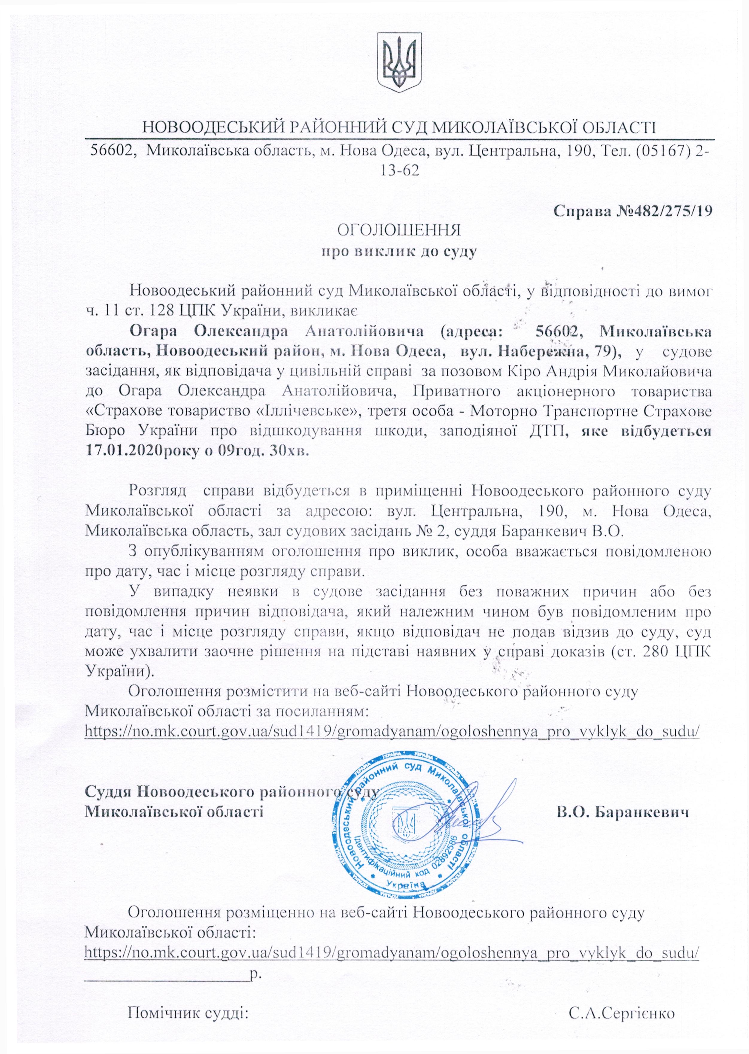 Оголошення про виклик до суду Огара Олександра Анатолійовича по справі 482/275/19