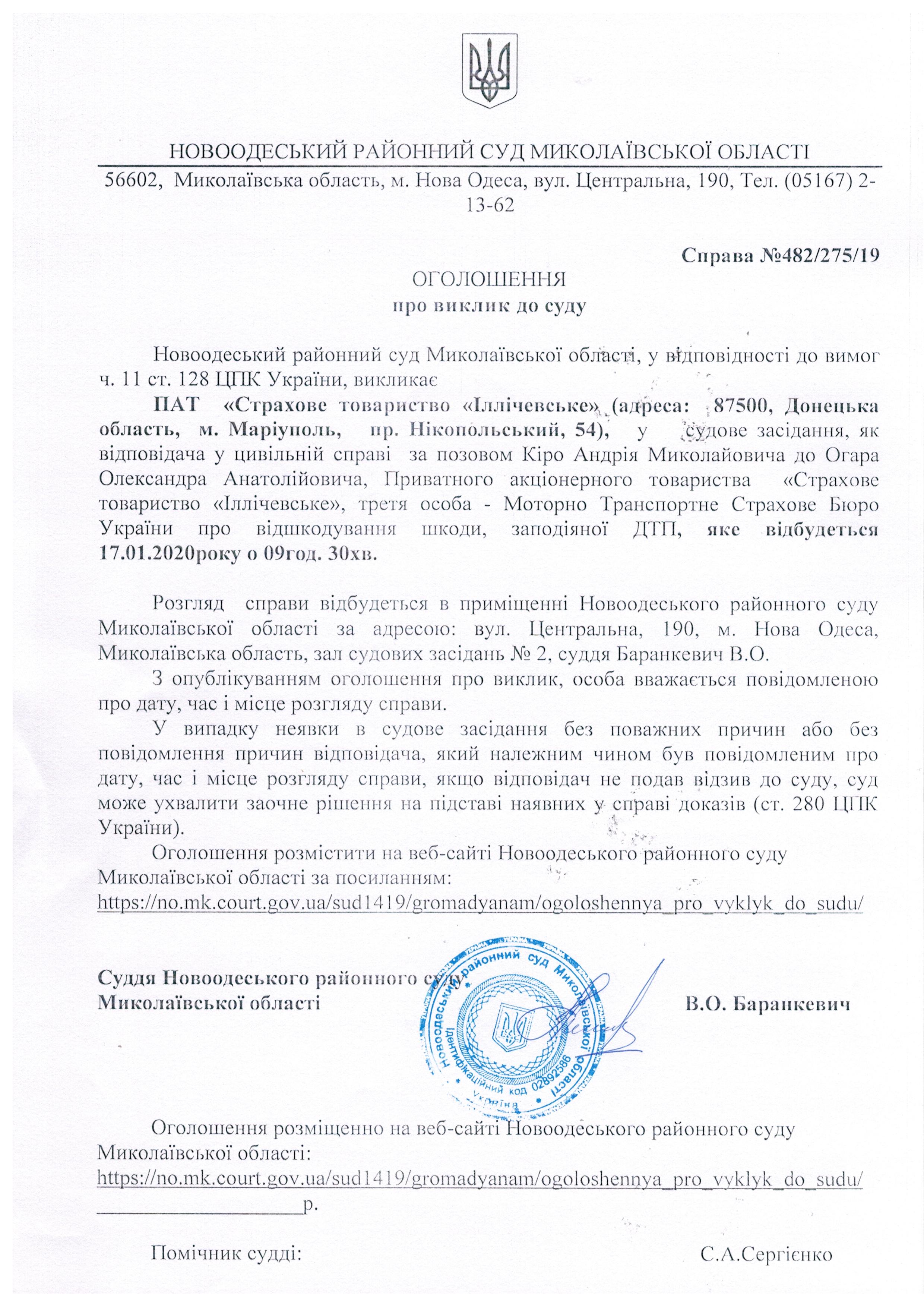 Оголошення про виклик до суду ПАТ "Старохове товариство "Іллічевське"" по справі 482/275/19