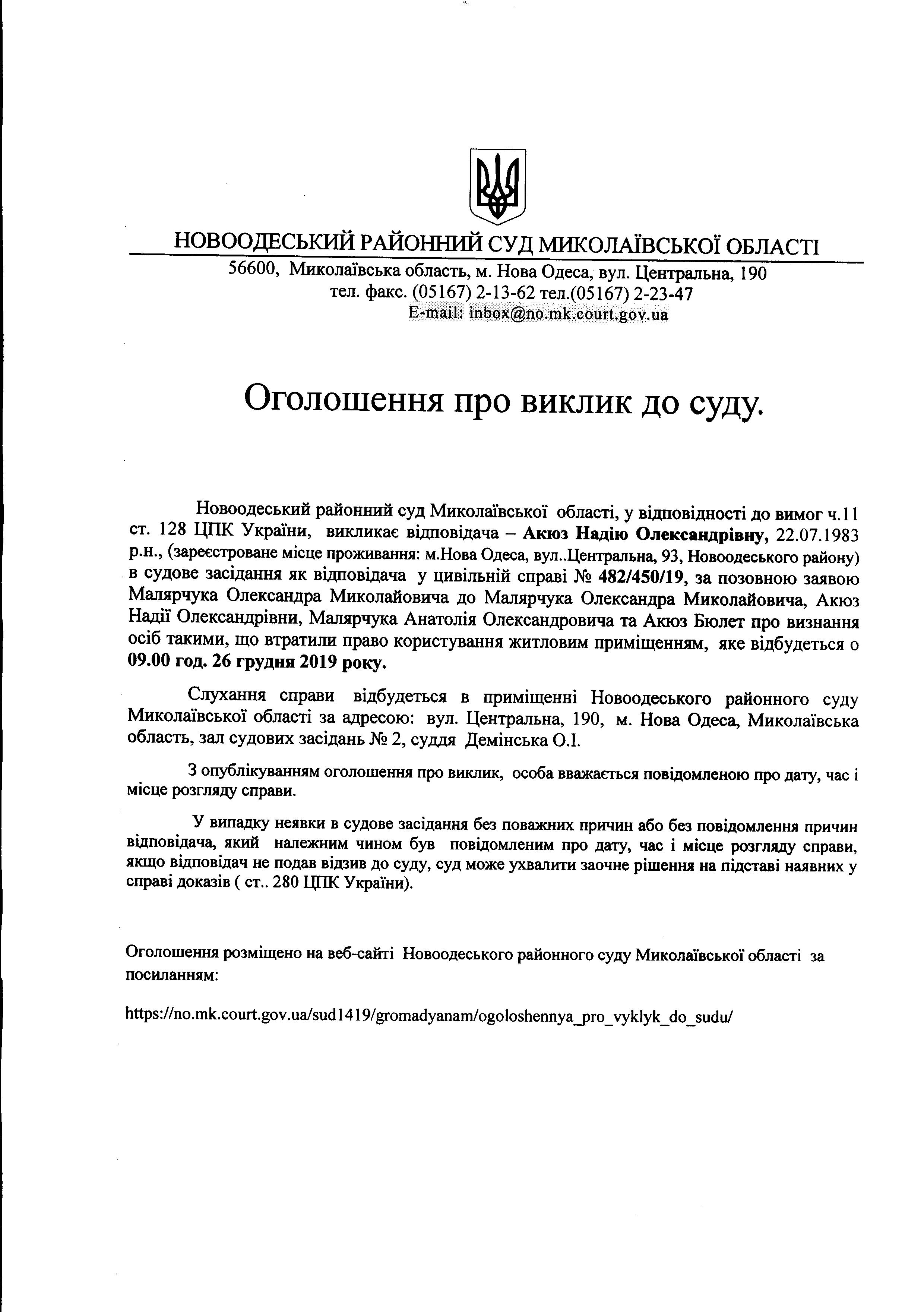Оголошення про виклик до суду Акюз Надію Олександрівну по справі 482/450/19