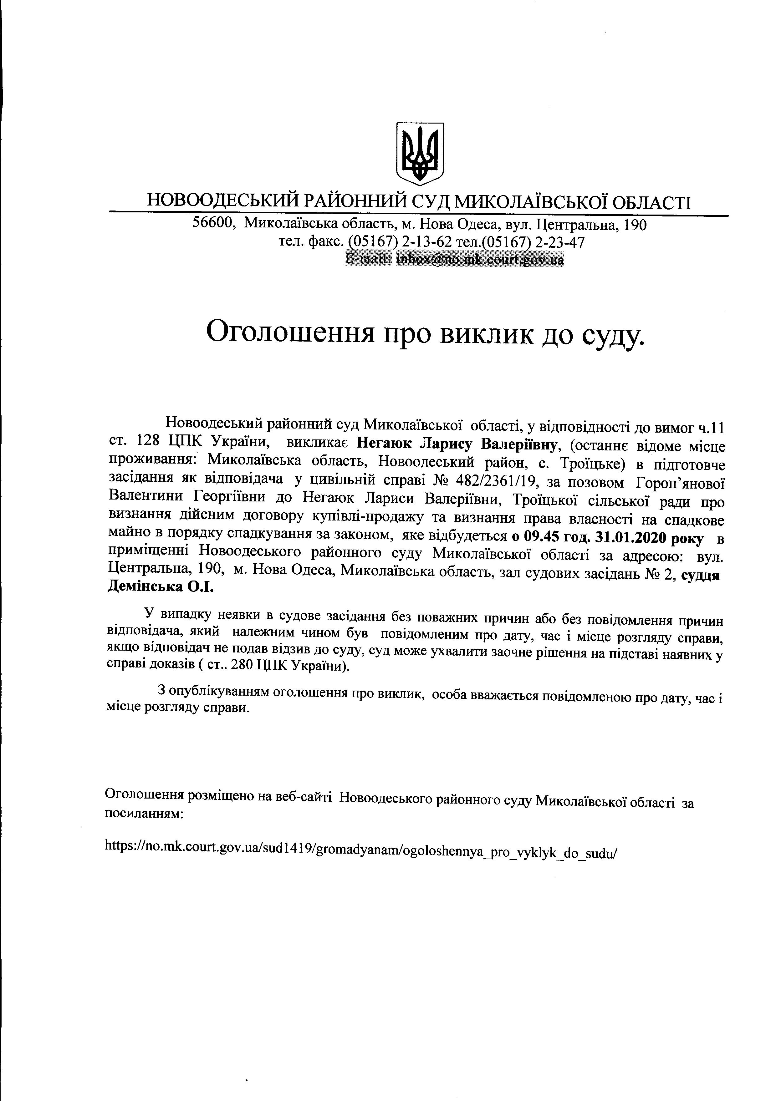 Оголошення про виклик до суду Негаюк Ларису Валеріївну по справі 482/2361/19