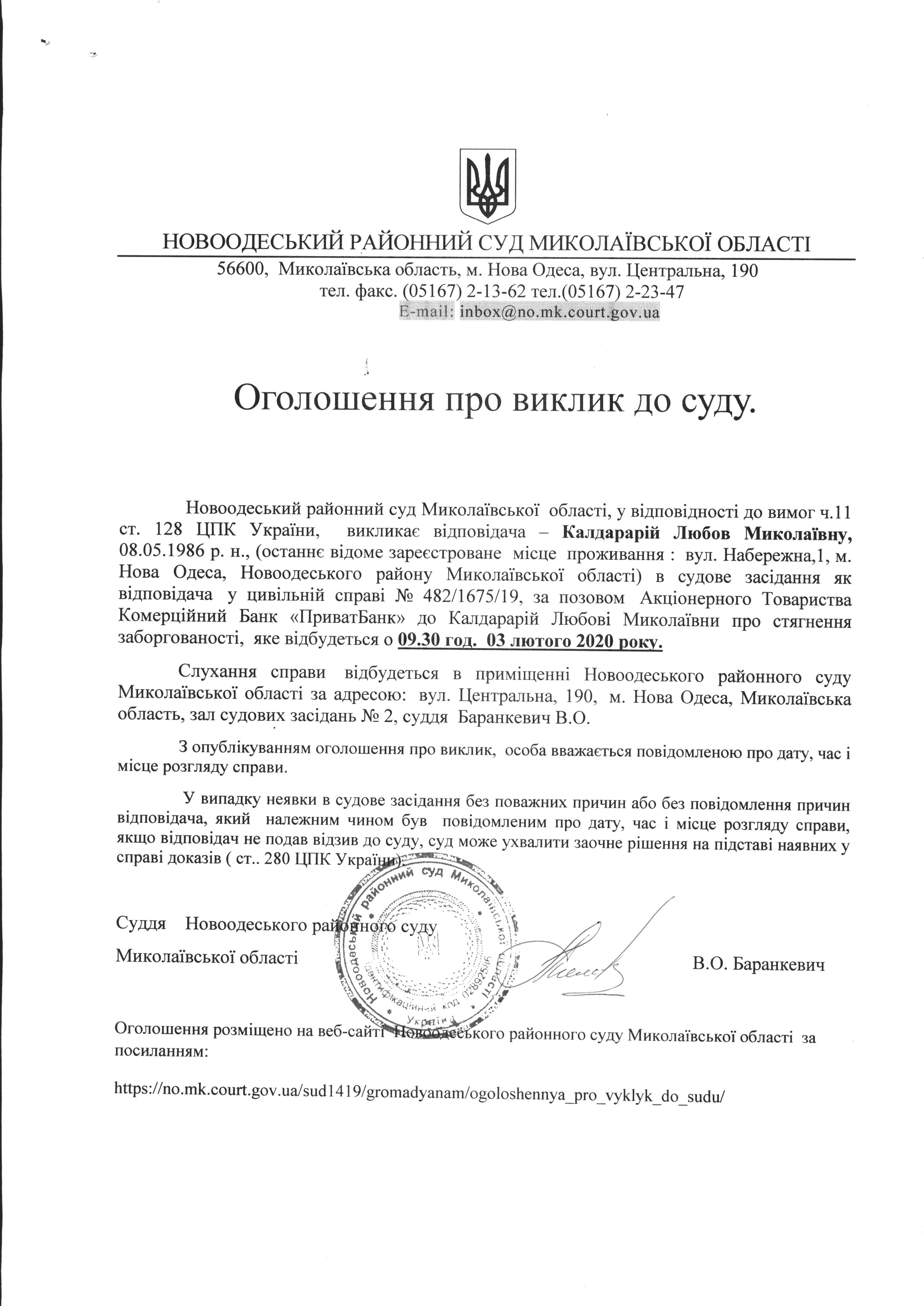 Оголошення про виклик до суду Калдарарій Любов Миколаївну по справі 482/1675/19