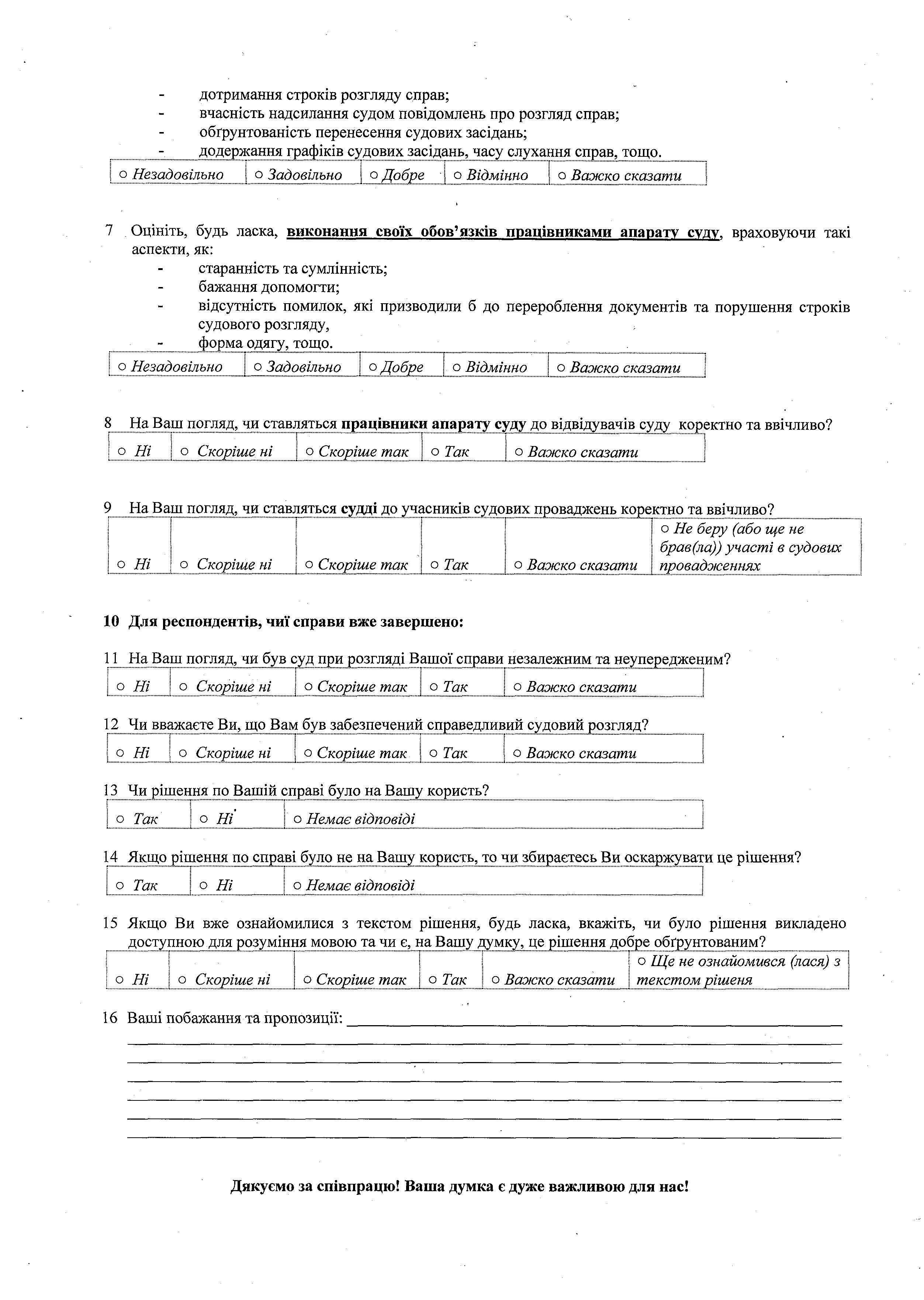Від Вашої участі в опитуванні, щирості та відповідального ставлення до опитування, залежить якість та повнота інформації, на підставі якої буде отримана загальна картина якості роботи суду.