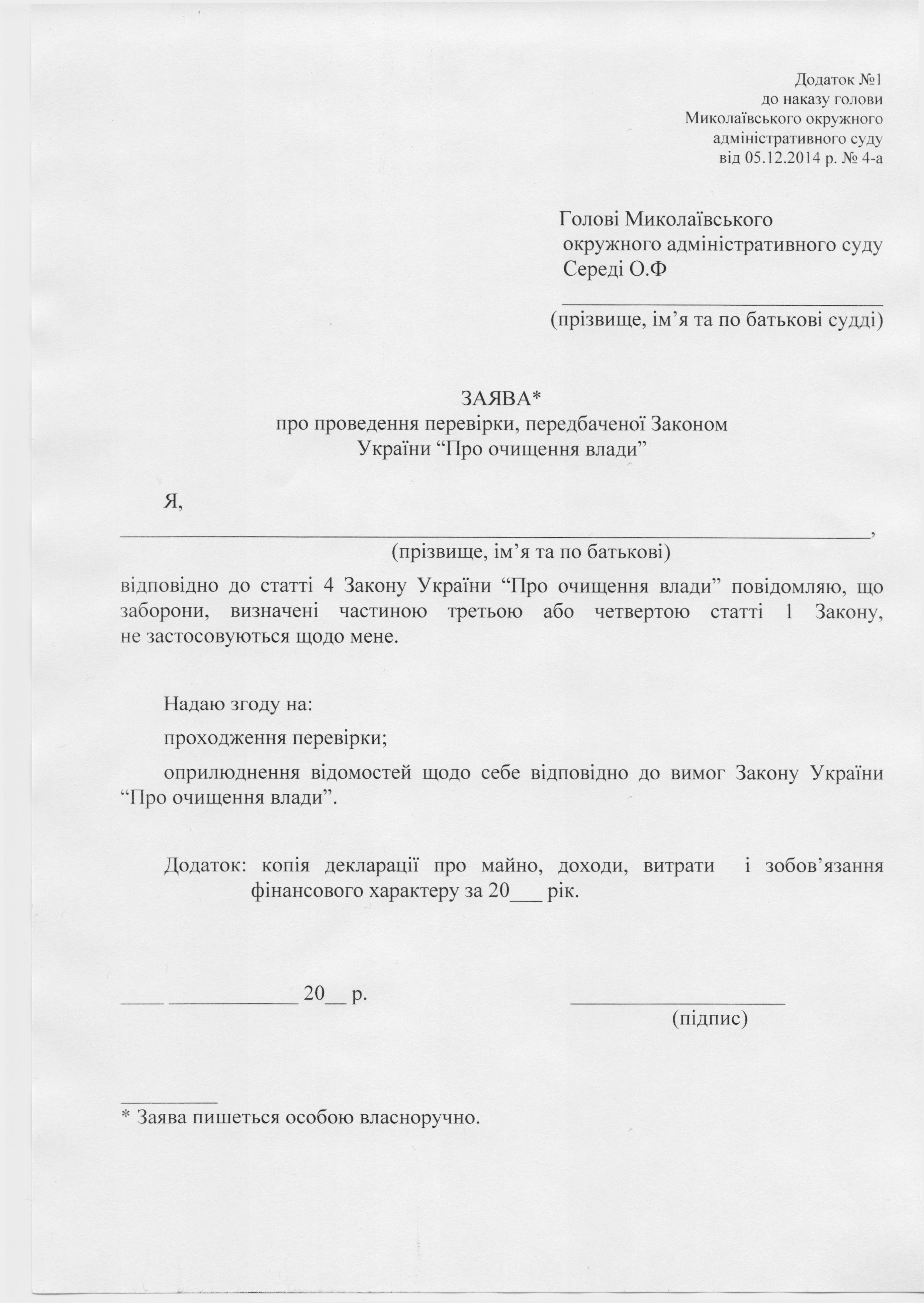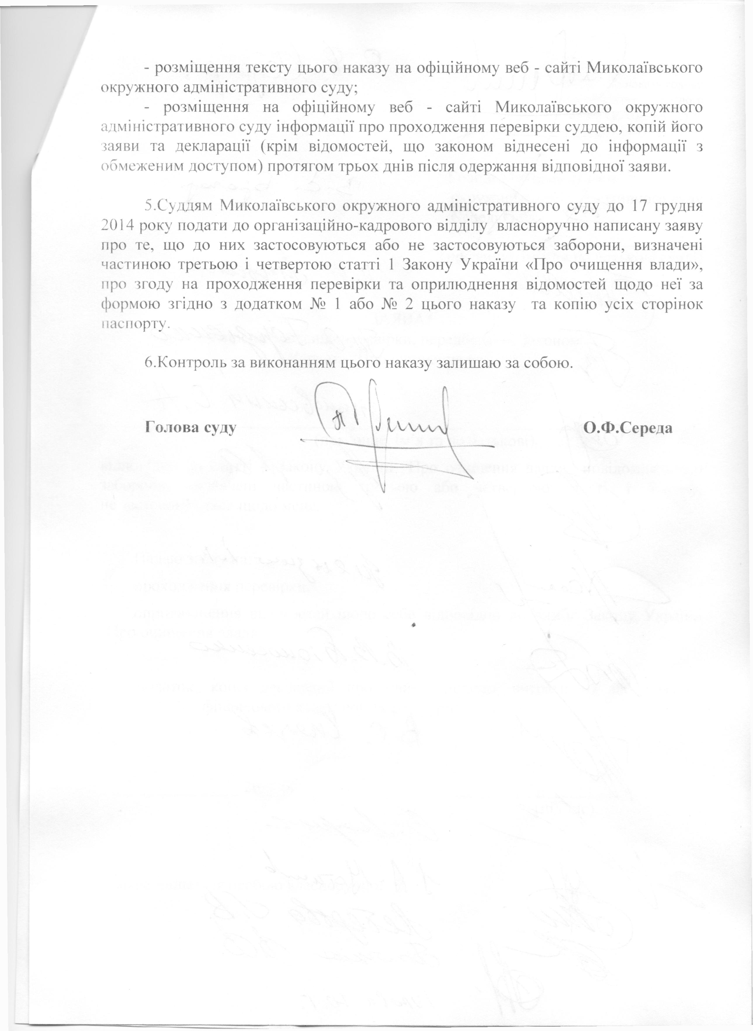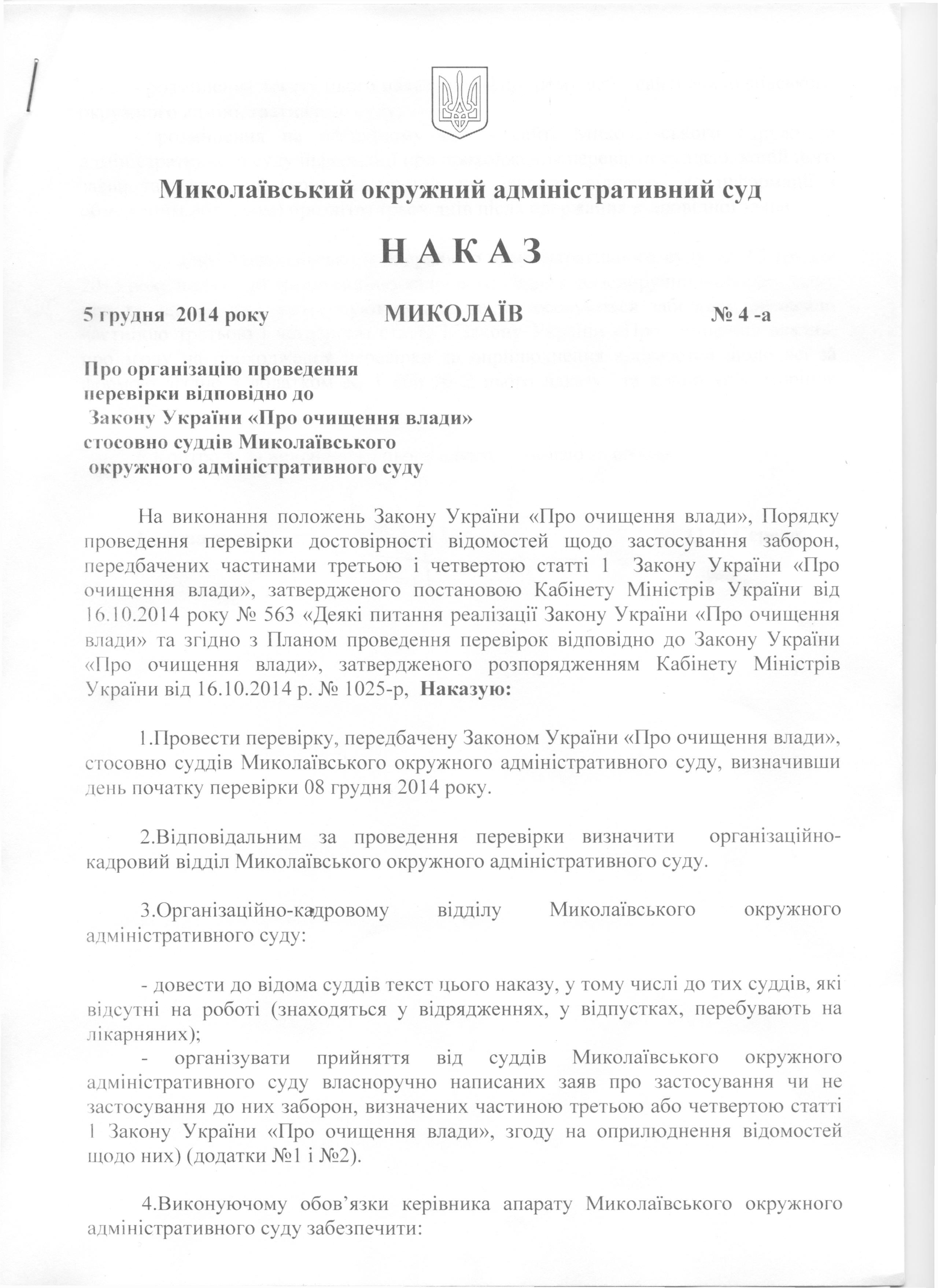 Наказ Миколаївського окружного адміністративного суду про організацію проведення перевірки відповідно до Закону України "Про очищення влади" стосовно суддів Миколаївського окружного адміністративного суду