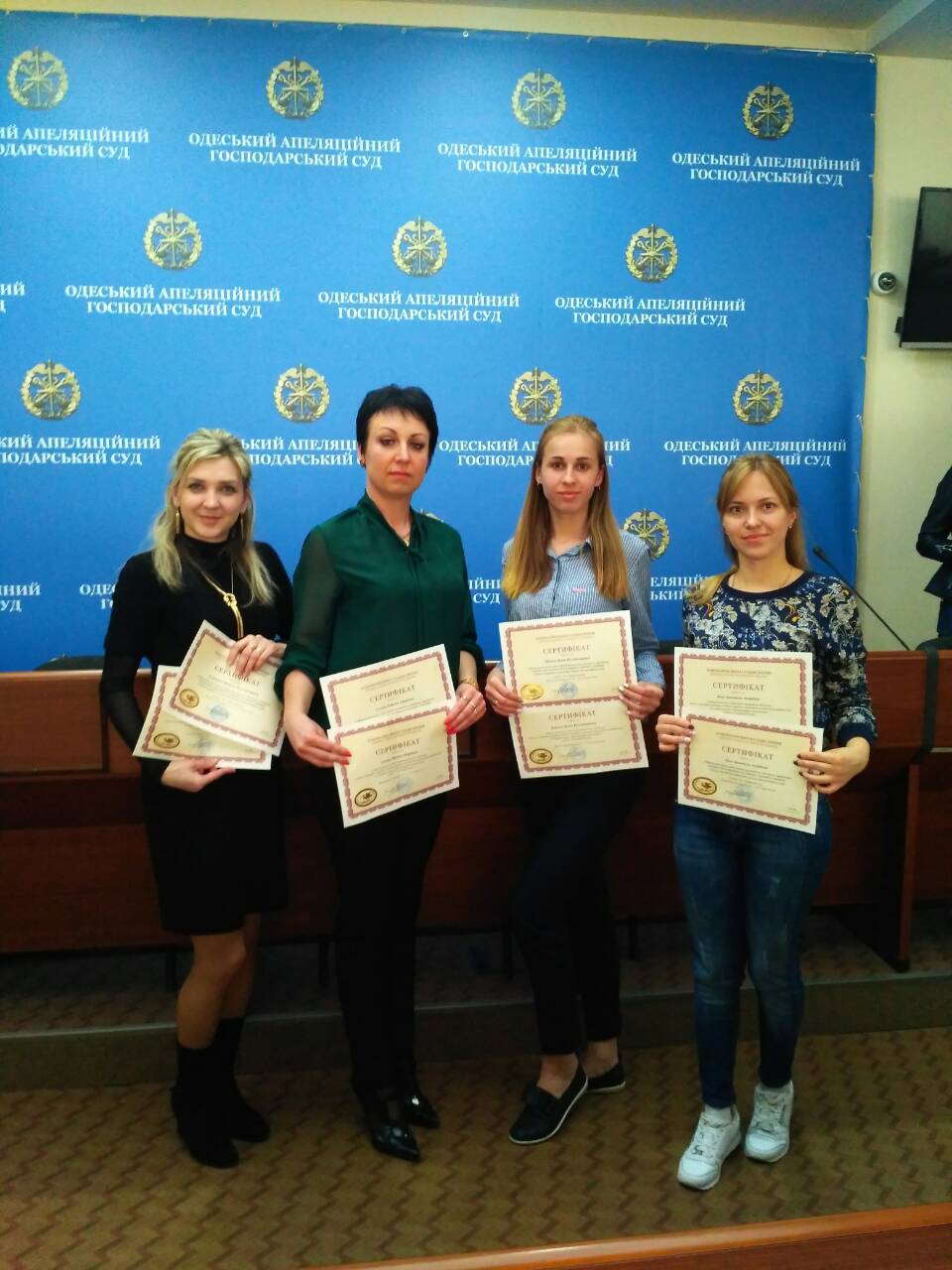 За результатами проведеної підготовки головний спеціаліст Аленіна Марина Андріївна, старший секретар суду Біла Анастасія Андріївна, секретар суду Ігнатенко Наталя Володимирівна та секретар суду Швачка Ірина Володимирівна отримали сертифікати Національної школи суддів України.
