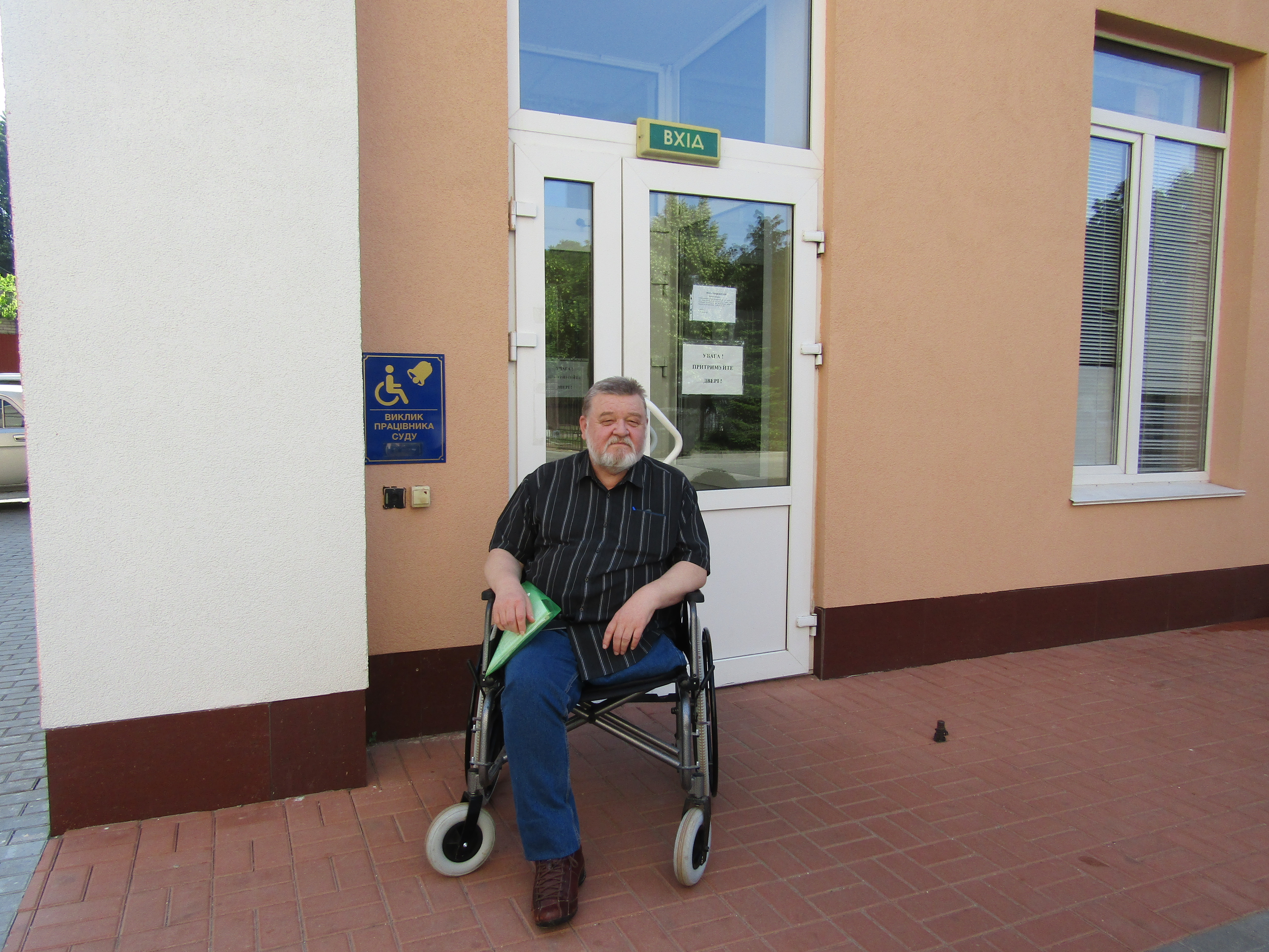 Відвідувач виїздить на стаціонарний пандус будівлі суду.
