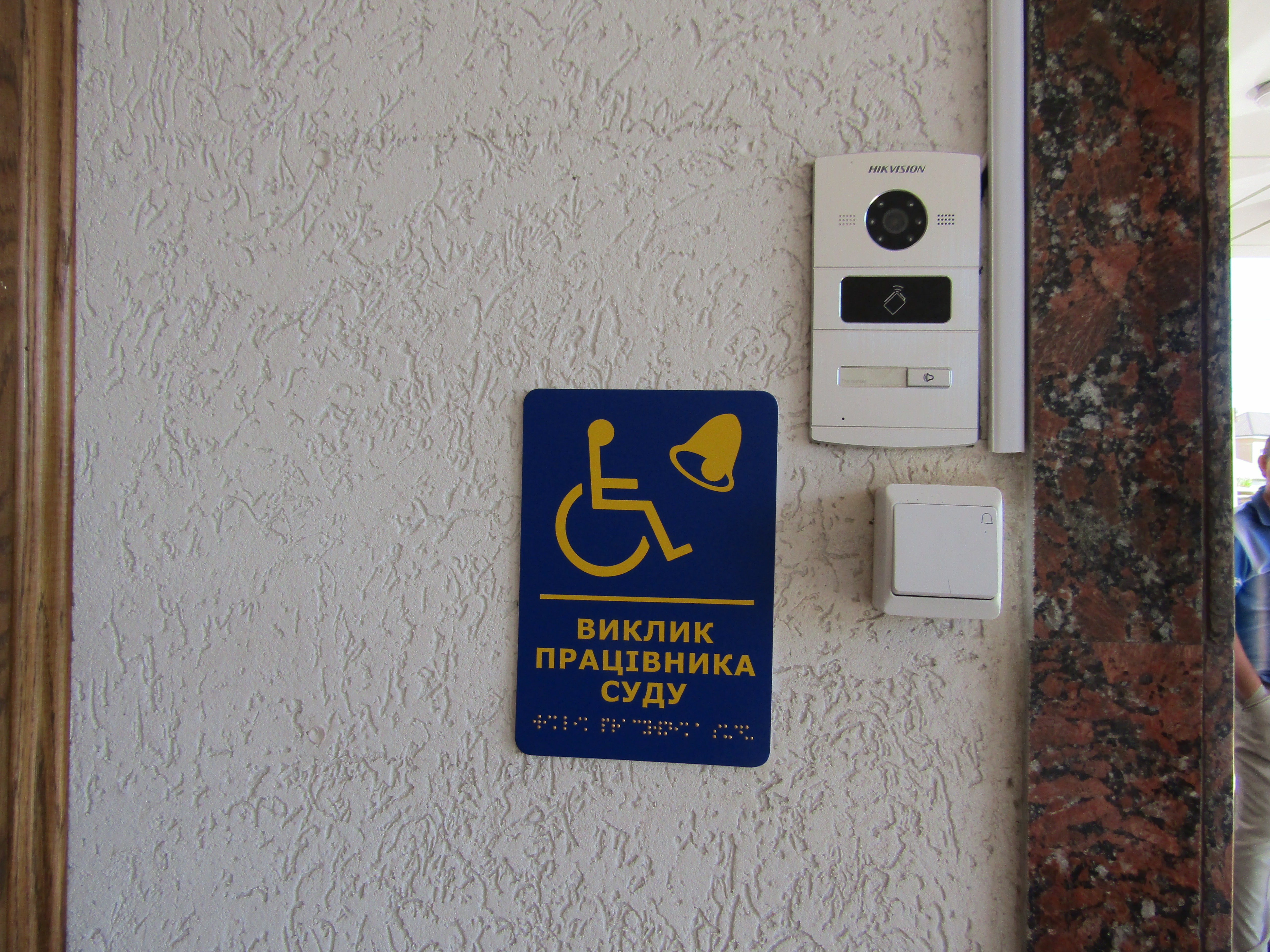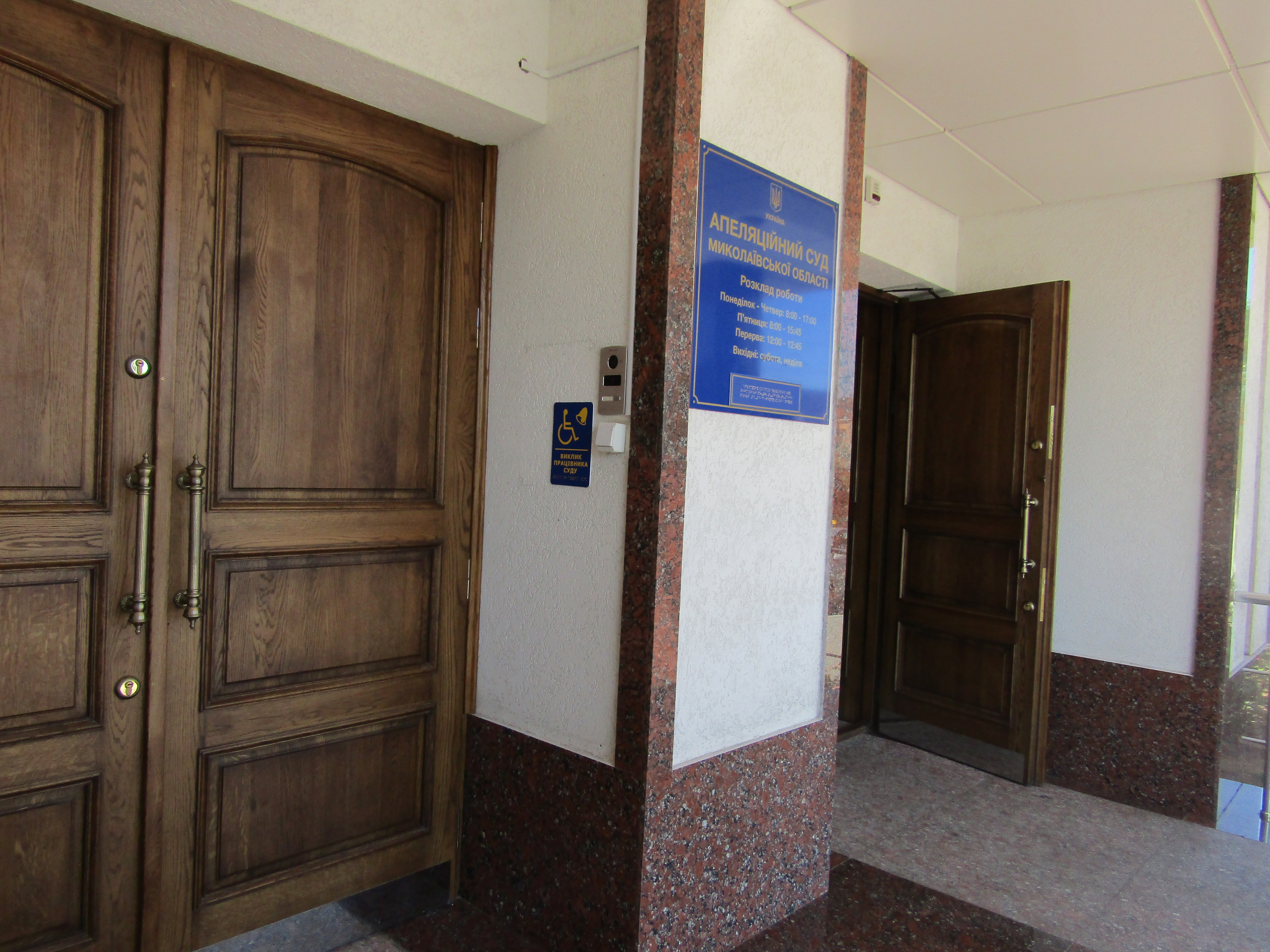 Головний вхід будівлі Апеляційного суду Миколаївської області обладнаний кнопкою виклику судового розпорядника.