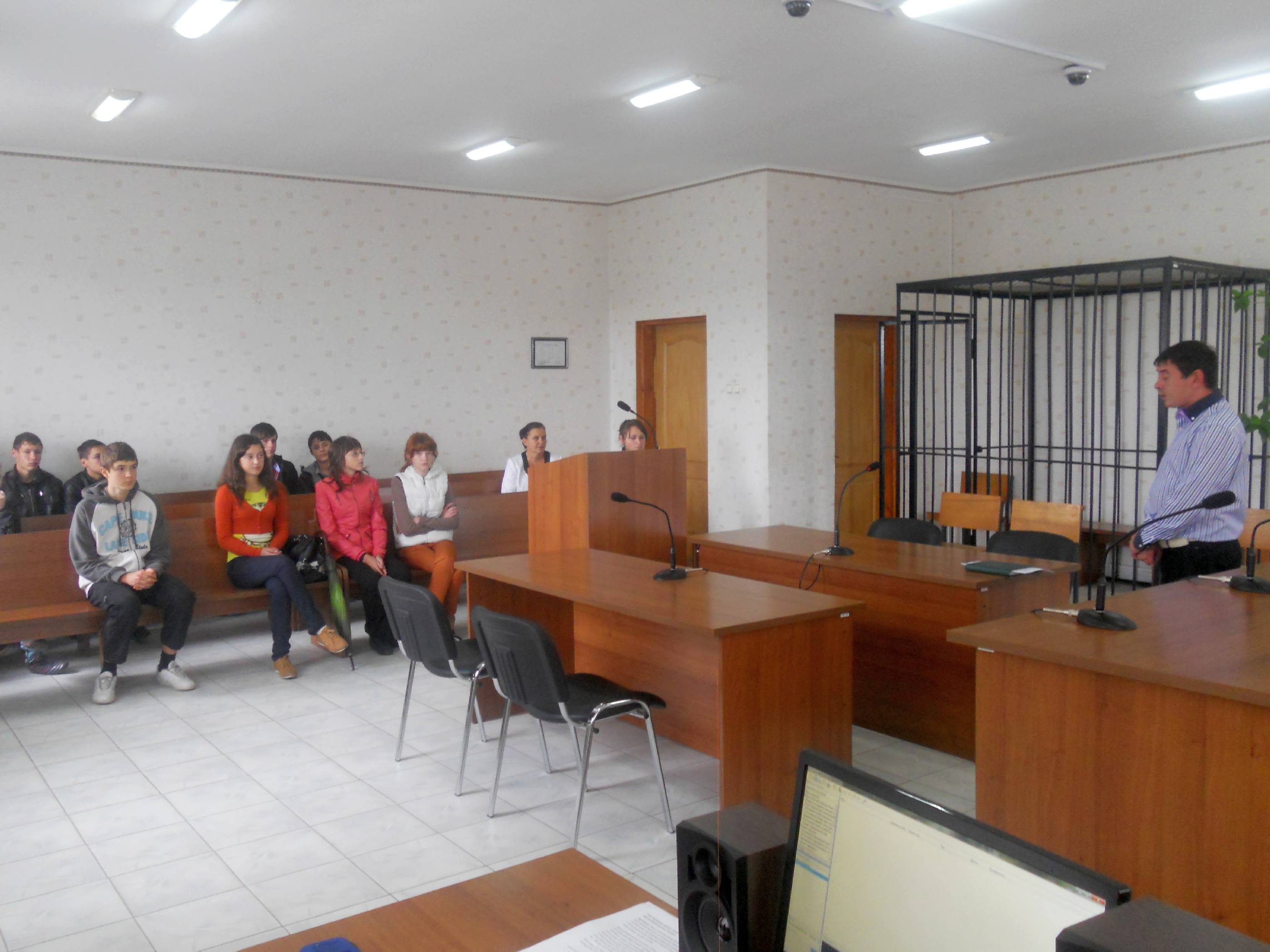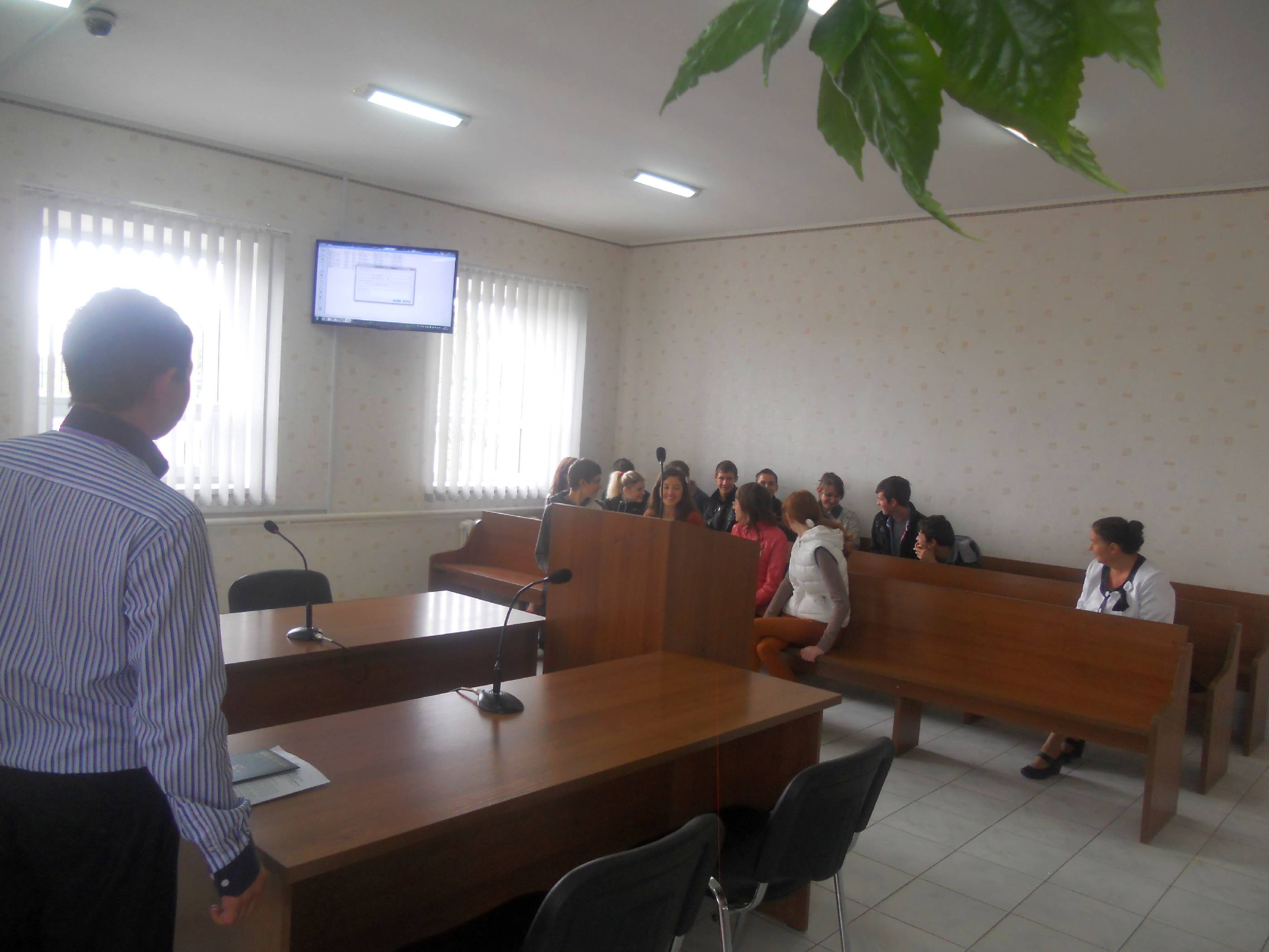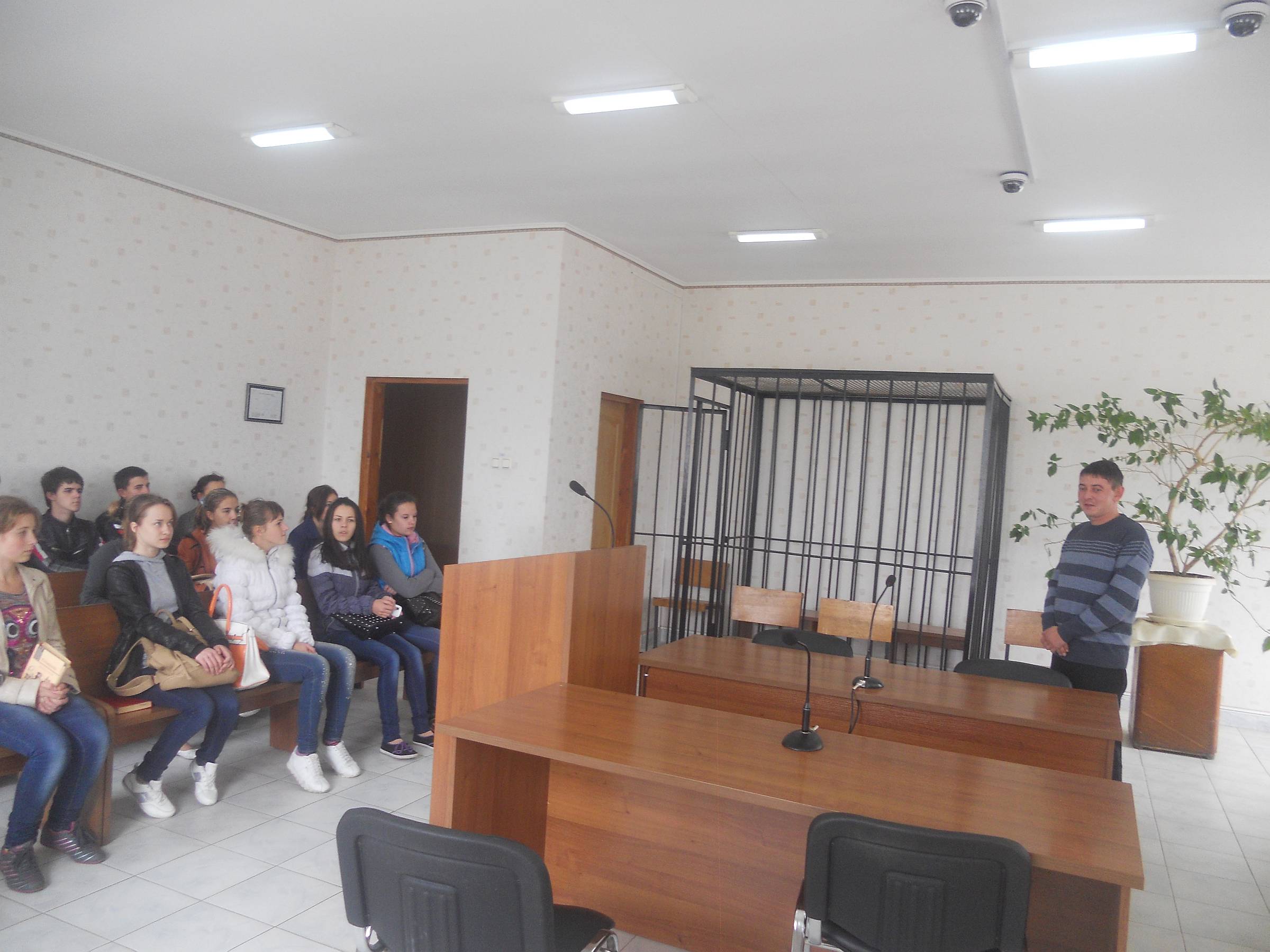 Керівник апарату Ананьївського районного суду Бацеля О.М. ознайомлює учнів з роботою суду. Кримінальний зал.