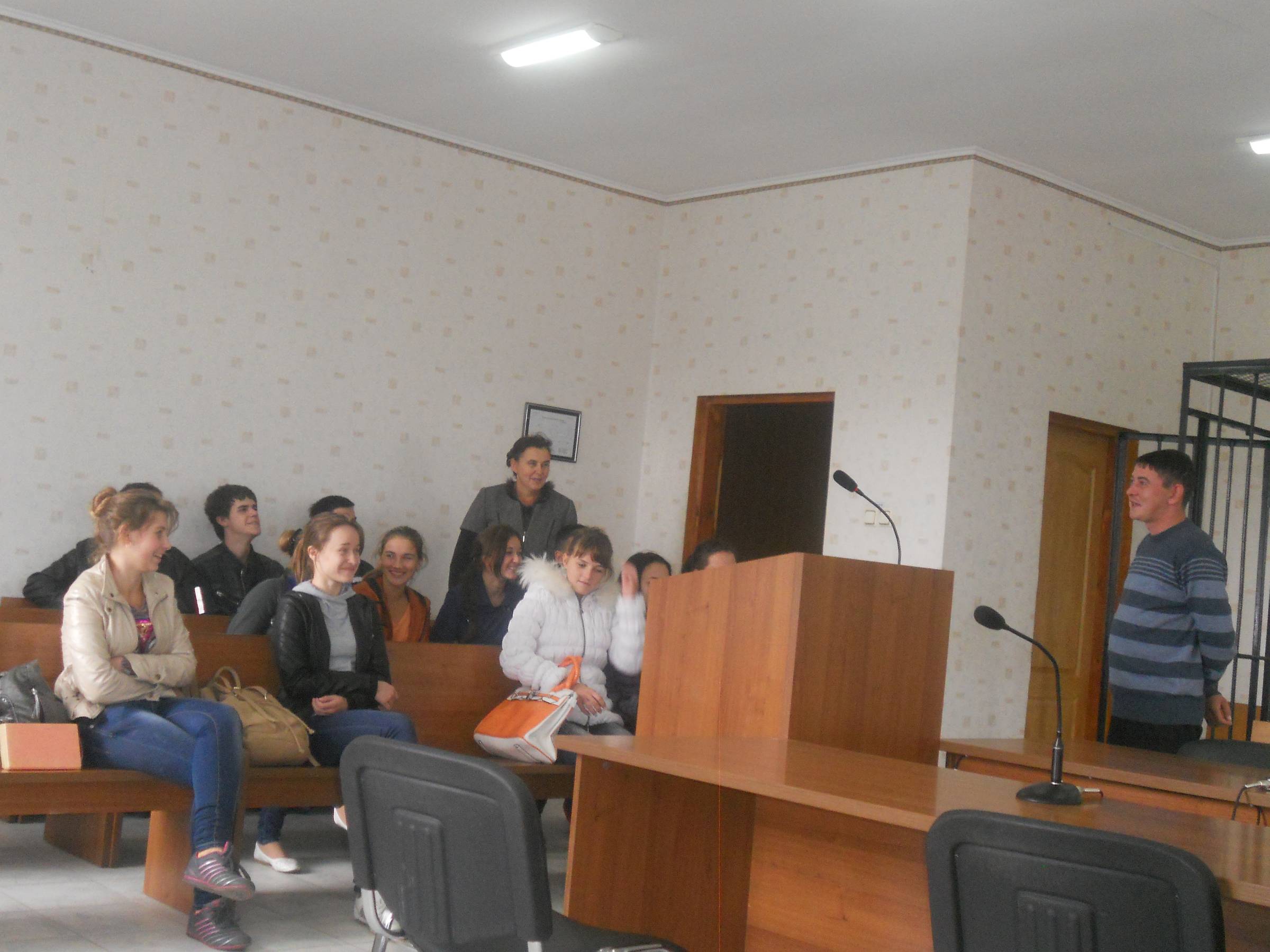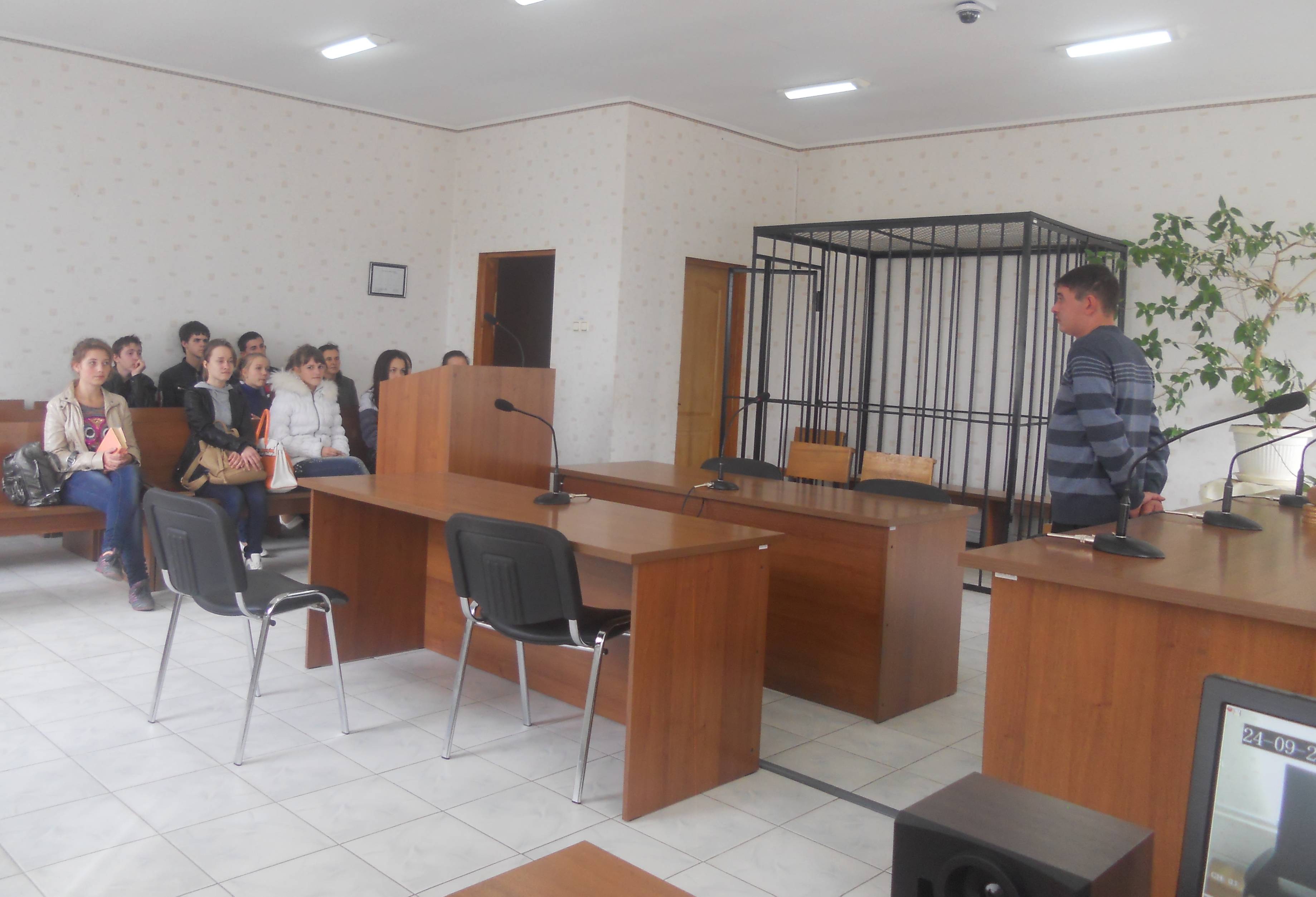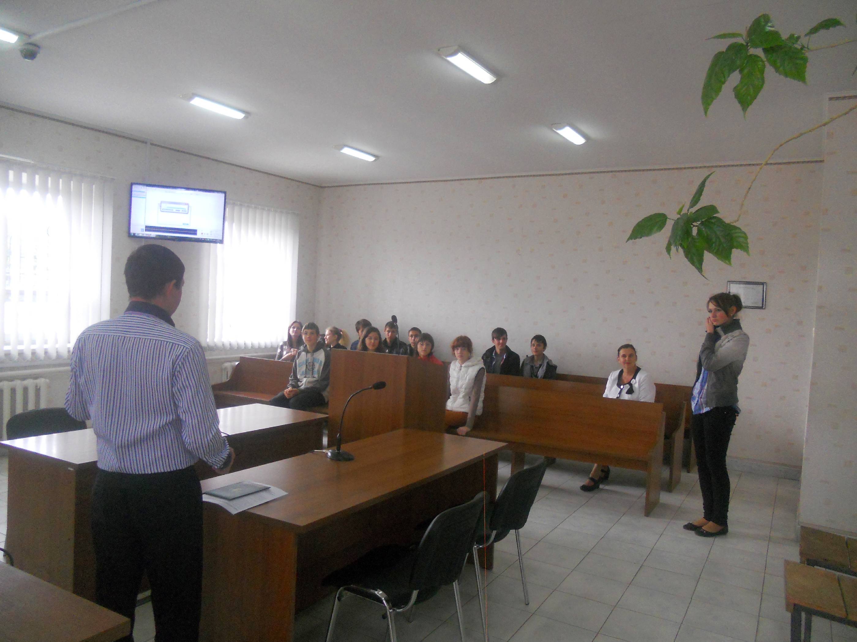 Керівник апарату Ананьївського районного суду Бацеля О.М. ознайомлює учнів з роботою суду. Кримінальний зал.