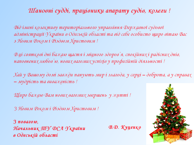 Привітання начальника ТУ ДСА України в Одеській області з з Новим Роком та Різдвом Христовим !