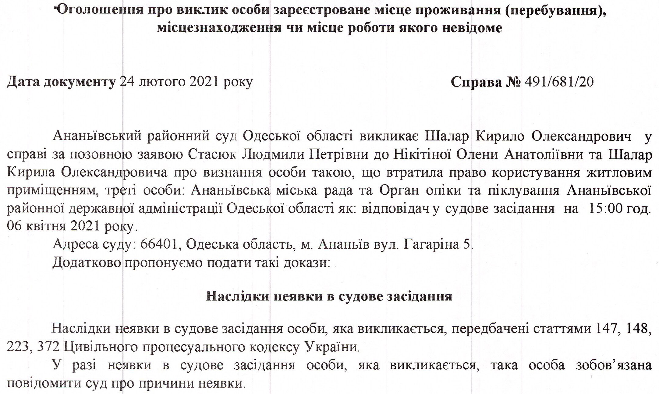 До суду викликається Шалар Кирило Олександрович