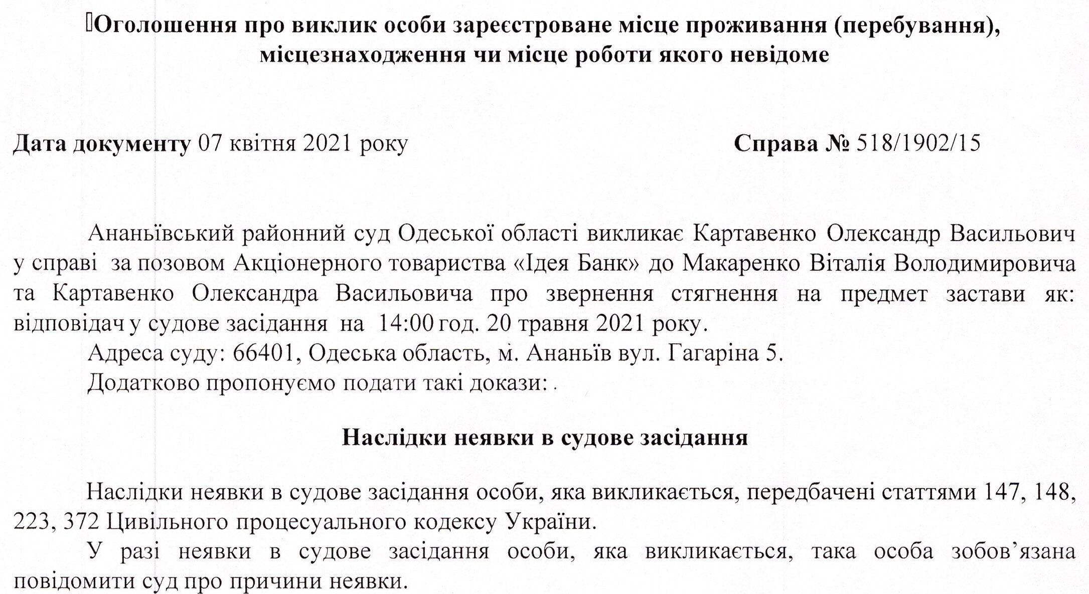 До суду викликається Картавенко Олександр Васильович