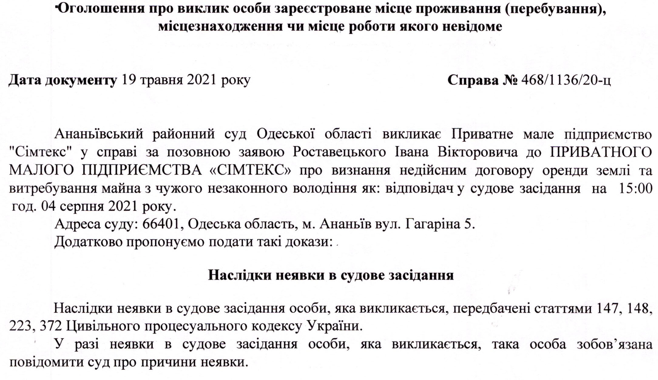 До суду викликається Приватне мале підприємство "Сімтекс"