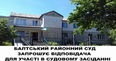 «Балтський районний суд Одеської області викликає в судове засідання відповідача Залата Віктора Петровича для розгляду цивільної справи за позовом Залата Олени Давидівни про розірвання шлюбу. Судове засідання відбудеться 25.09.2018 року о 08:30 год. в приміщенні Балтського районного суду Одеської області за адресою: м. Балта, вул. Кузнечна, 56, Одеської області. У разі неявки в судове засідання відповідача справа може бути розглянута за його відсутності за наявними у справі доказами. Головуючий суддя: Тітова Т.П.»