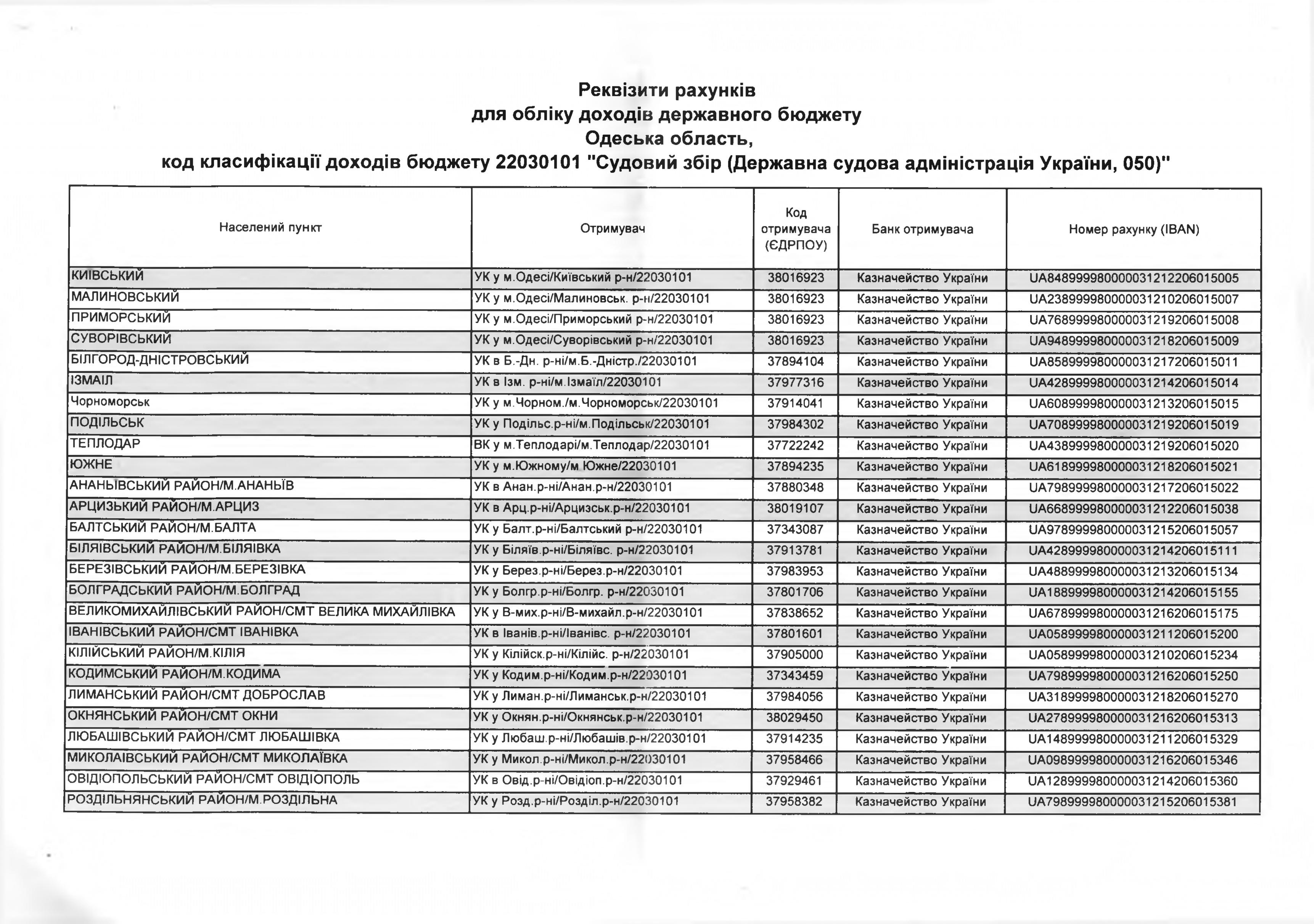 Вiдповiдно до листа Головного управлiння Державної казначейської служби України вiд 28.08.2019 №06-08/01-06/4357 «Про заміну реквізитів рахункiв для зарахування надходжень до бюджетів вiдповiдно до стандарту IBAN», повідомляємо про нові реквiзити рахункiв для обліку доходiв державного бюджету за кодом класифгкації доходiв бюджету 22030101 «Судовий збір (Державна судова адміністрація України, 050)».