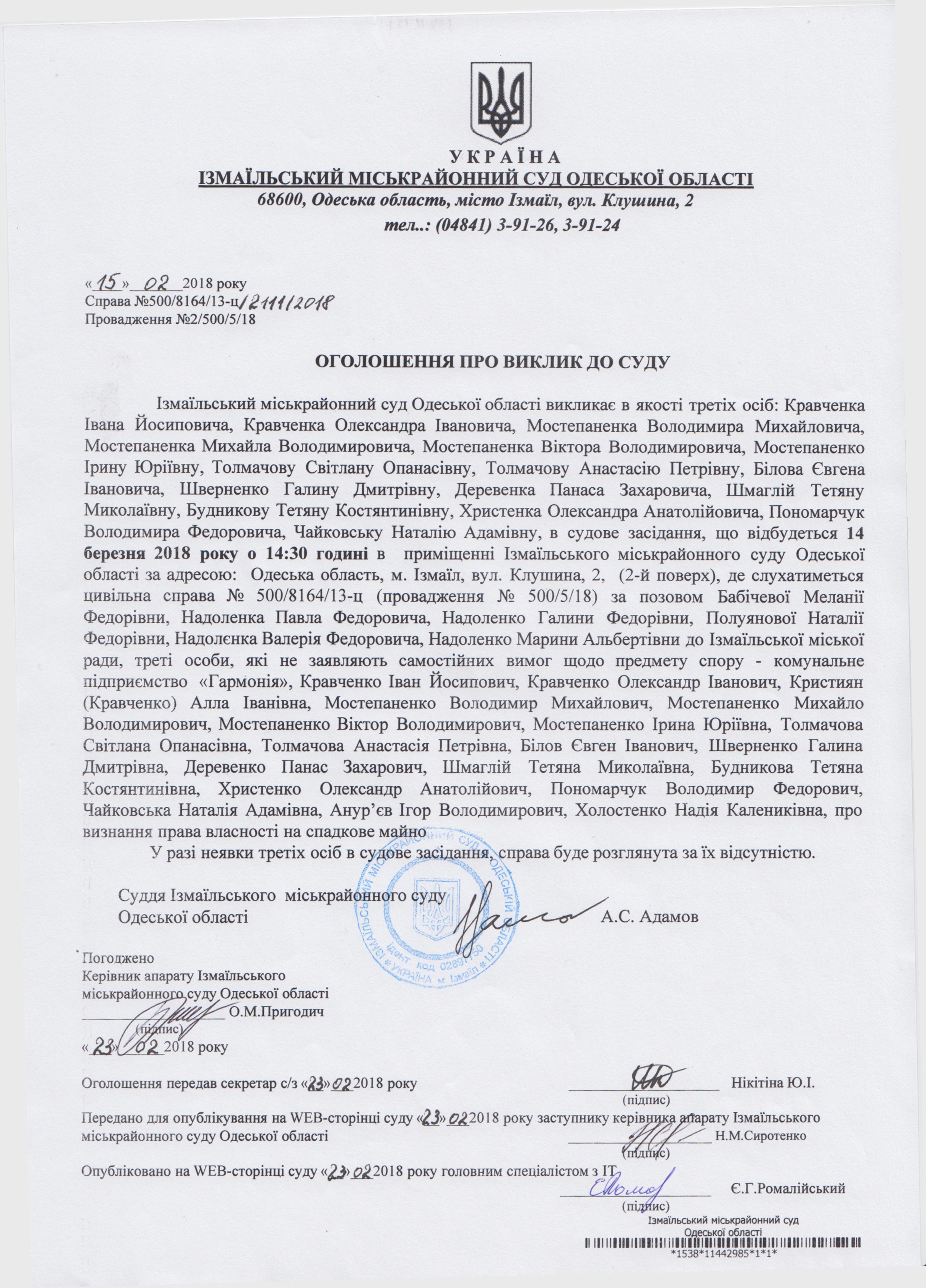 УВАГА!!! Оголошення про виклик до суду!!!