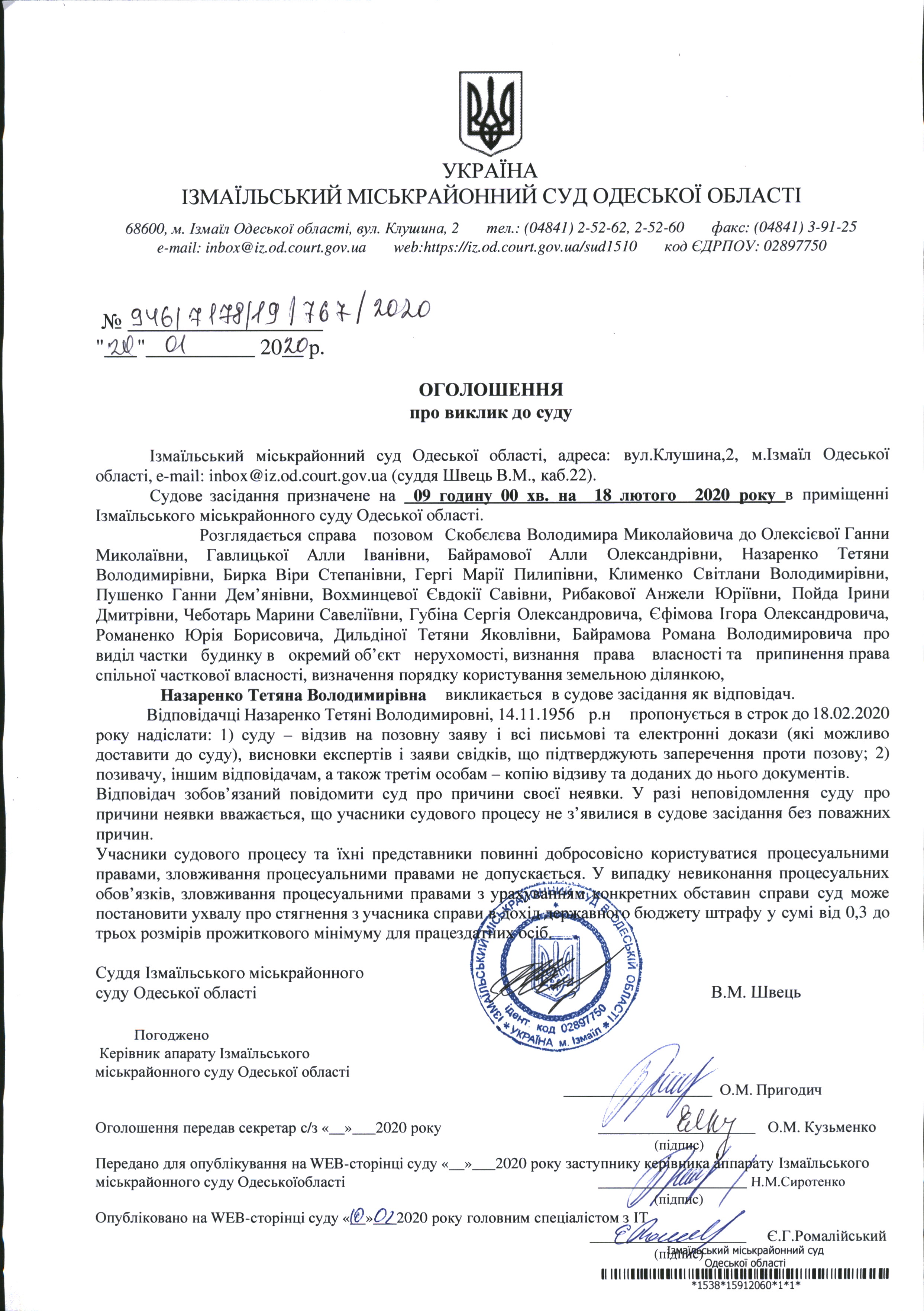 Оголошення про виклик у судове засідання Назаренко Т.В.