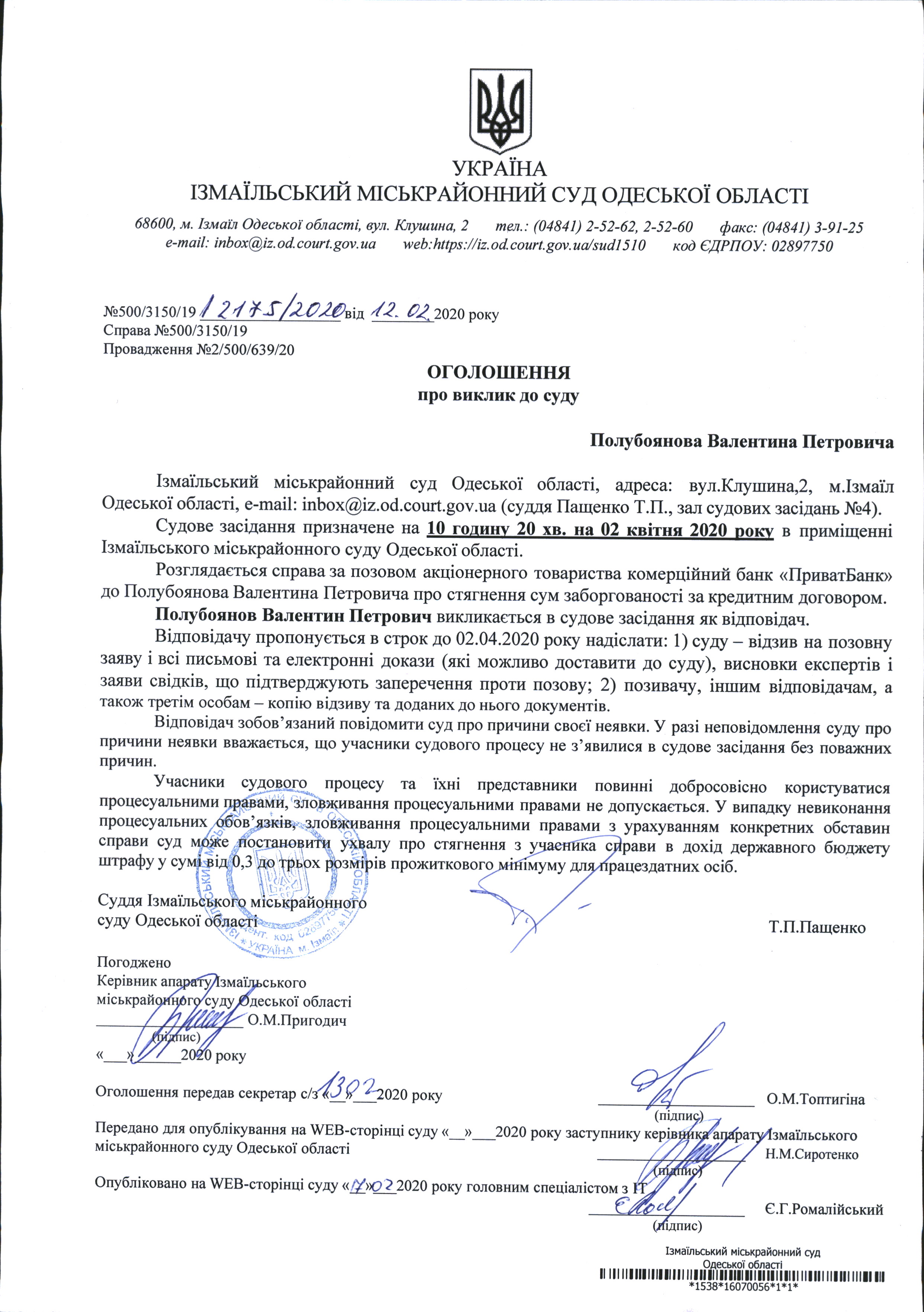 Оголошення про виклик у судове засідання Полубоянов В.П.