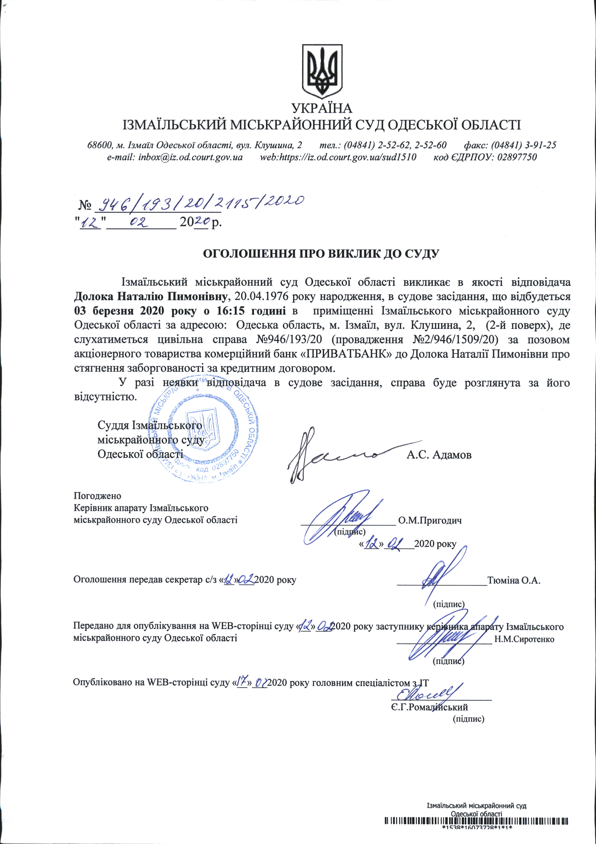 Оголошення про виклик у судове засідання Долока Н.П.