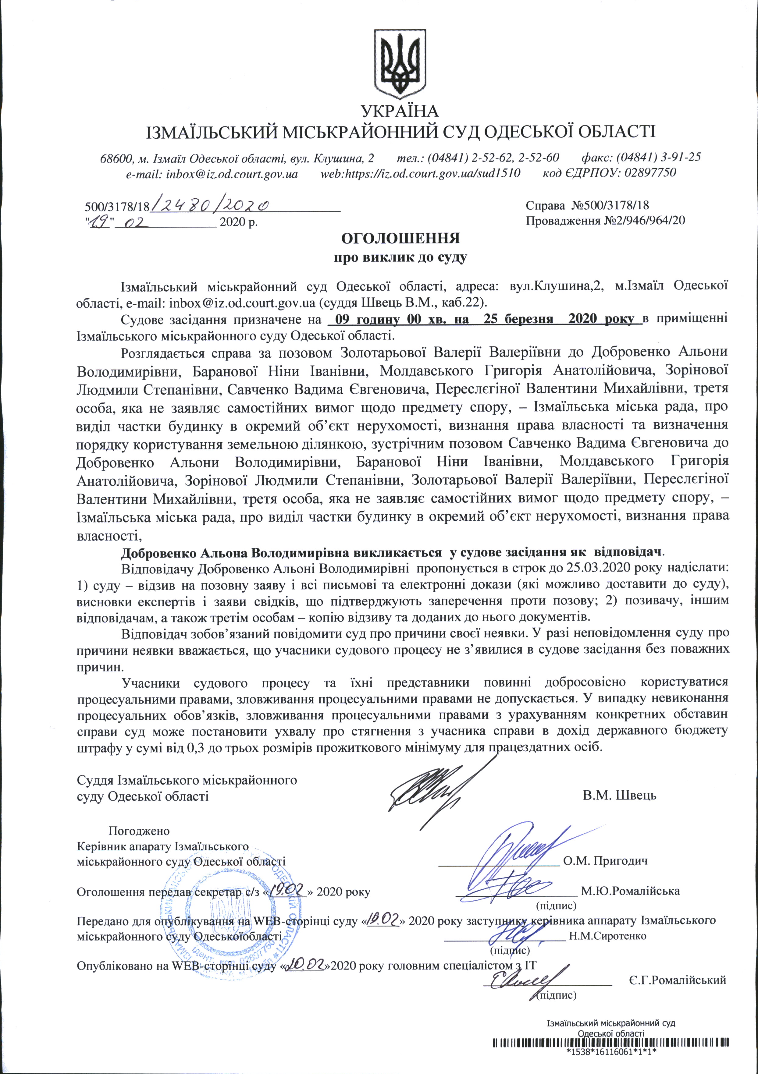 Оголошення про виклик у судове засідання Добровенко А.В.