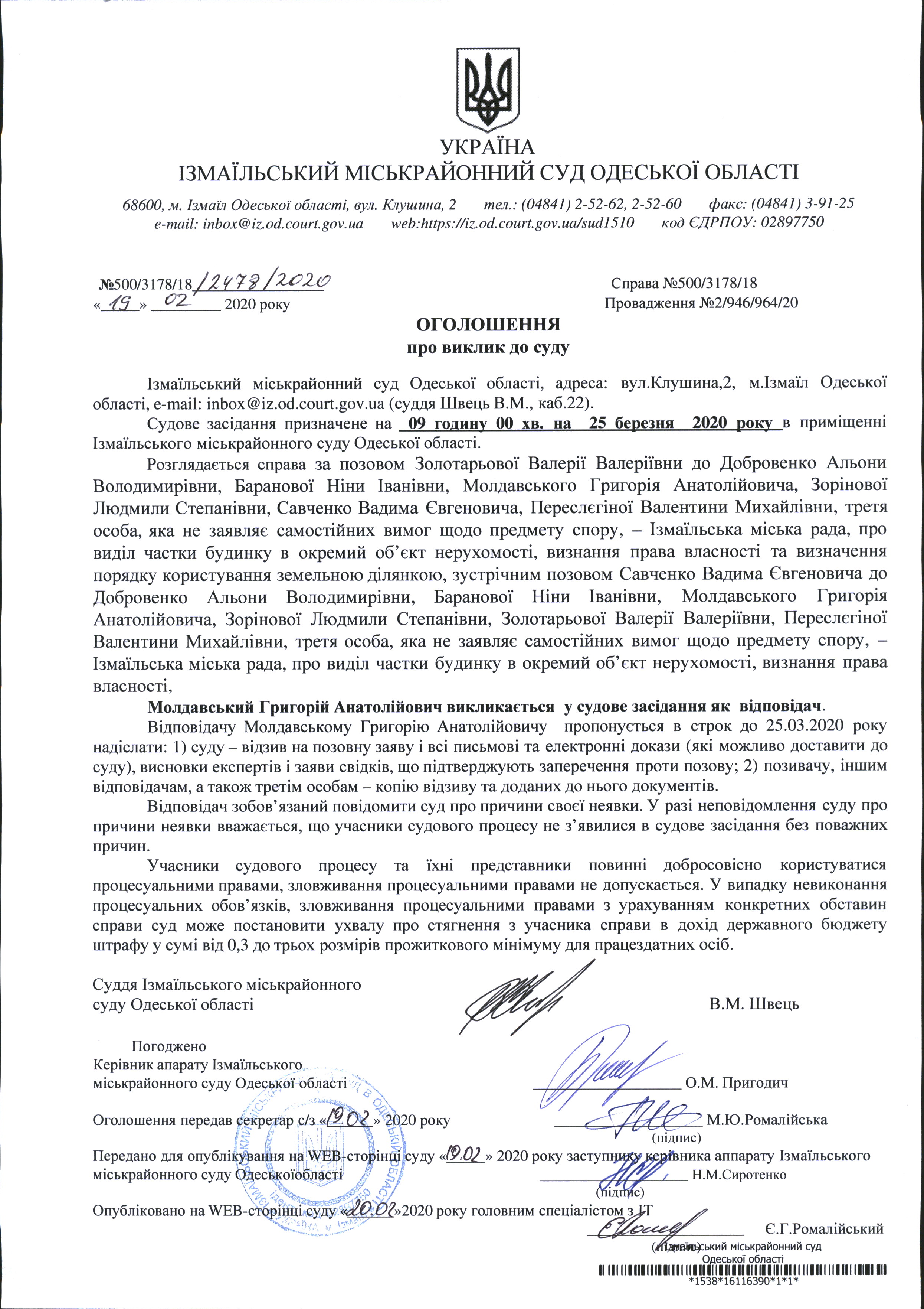 Оголошення про виклик у судове засідання Молдавський Г.А.