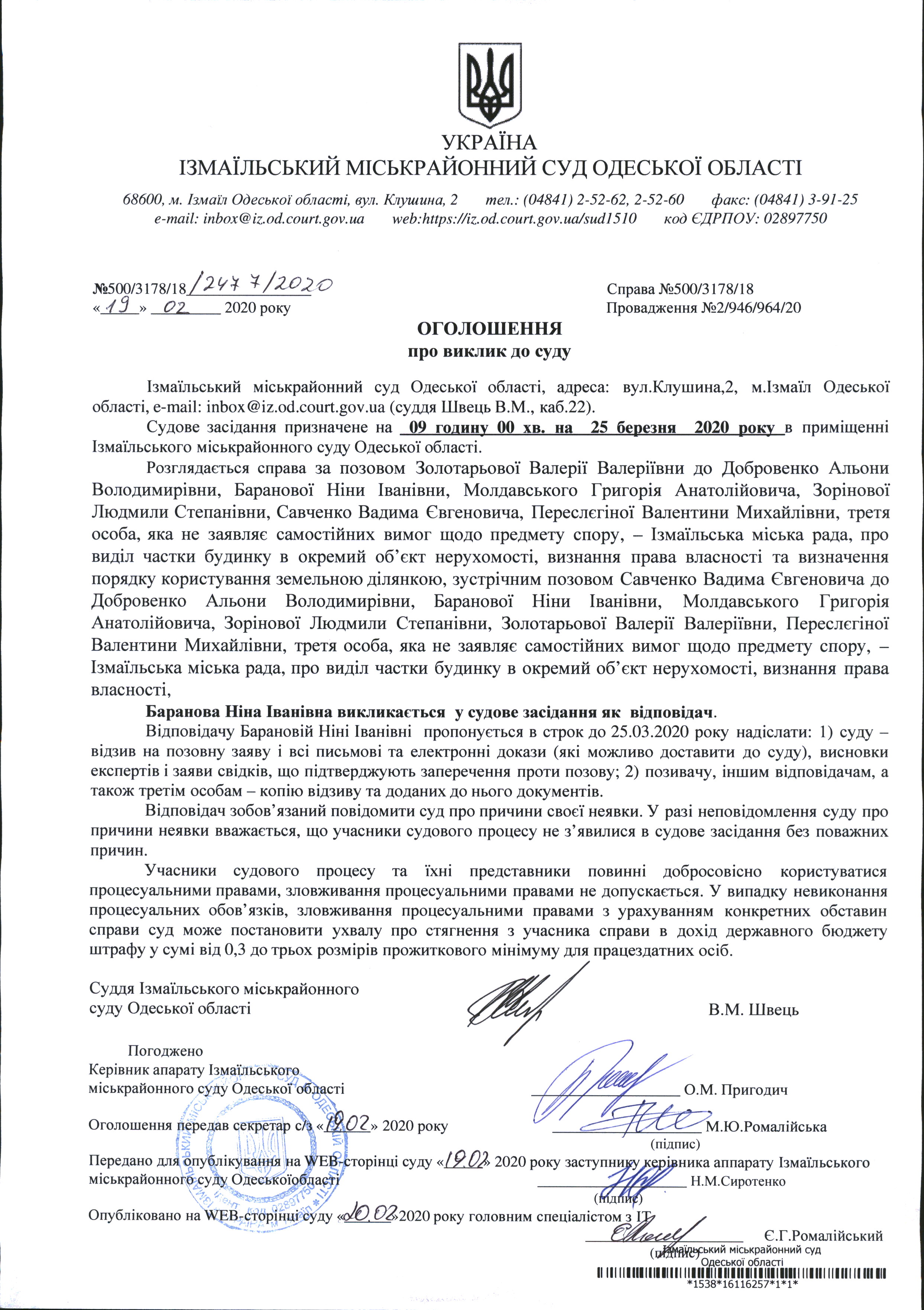 Оголошення про виклик у судове засідання Баранова Н.І.