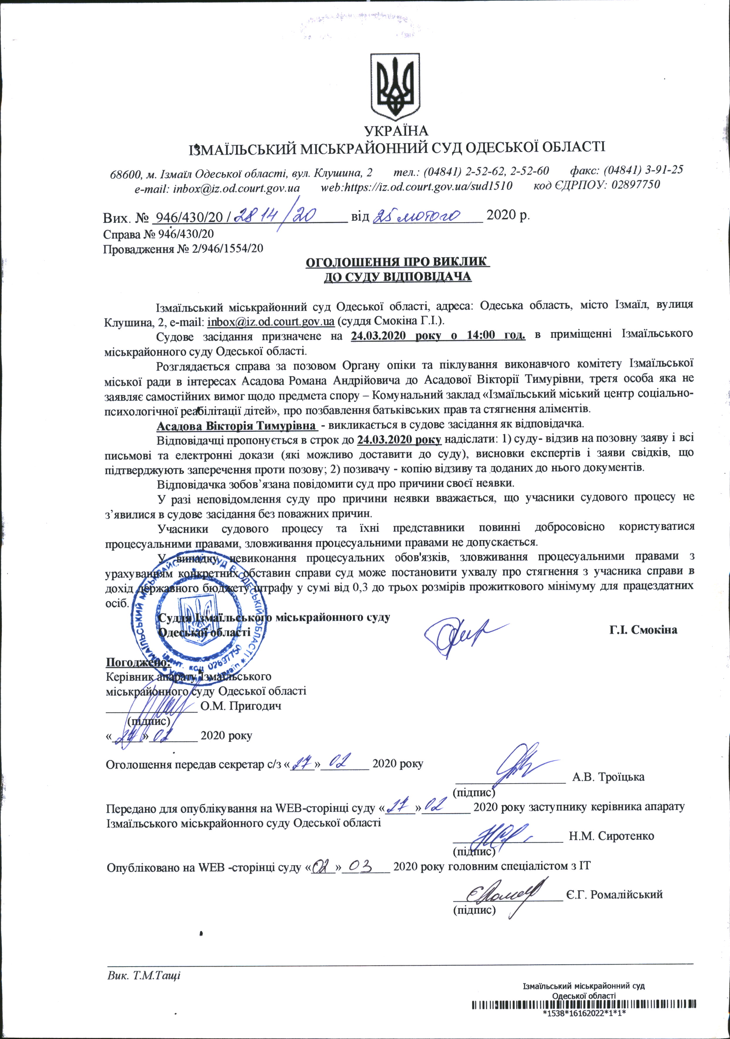 Оголошення про виклик у судове засідання Асадова В.Т.