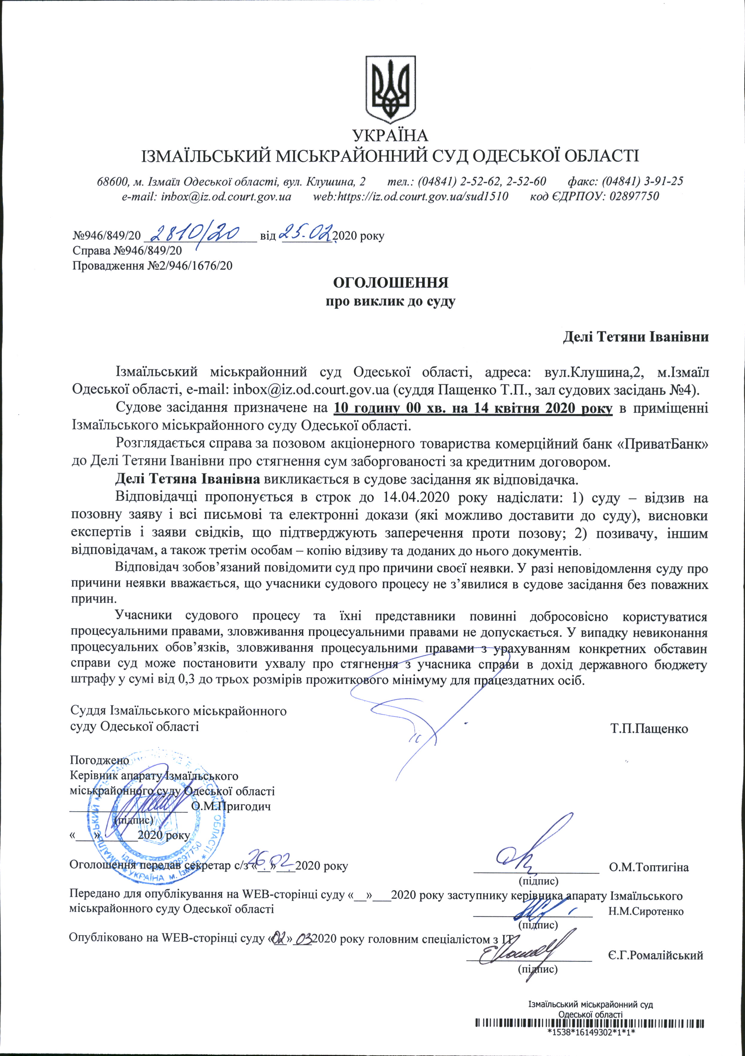 Оголошення про виклик у судове засідання Делі Т.І.