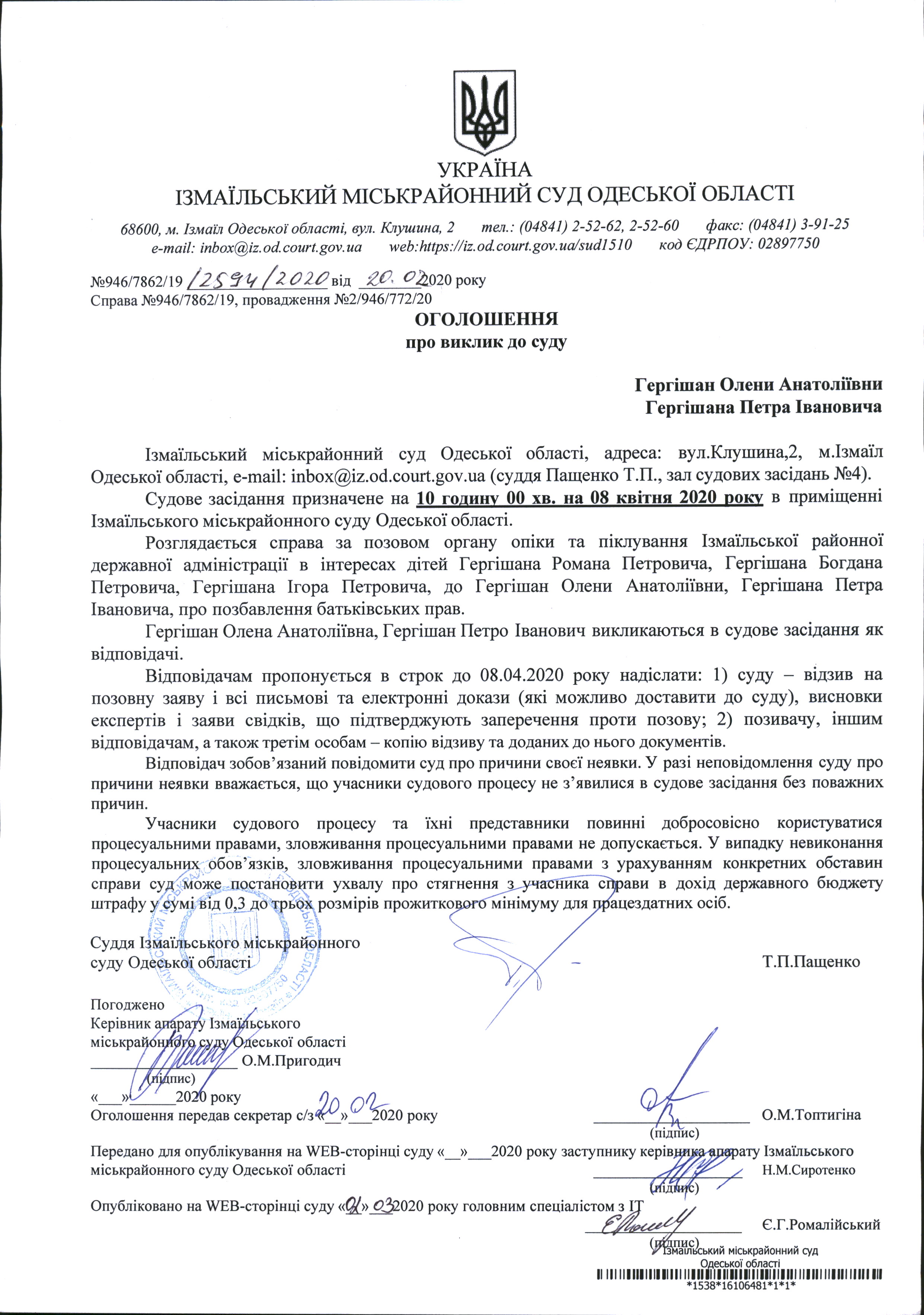 Оголошення про виклик у судове засідання Гергішан О.А., Гергішан П.І.