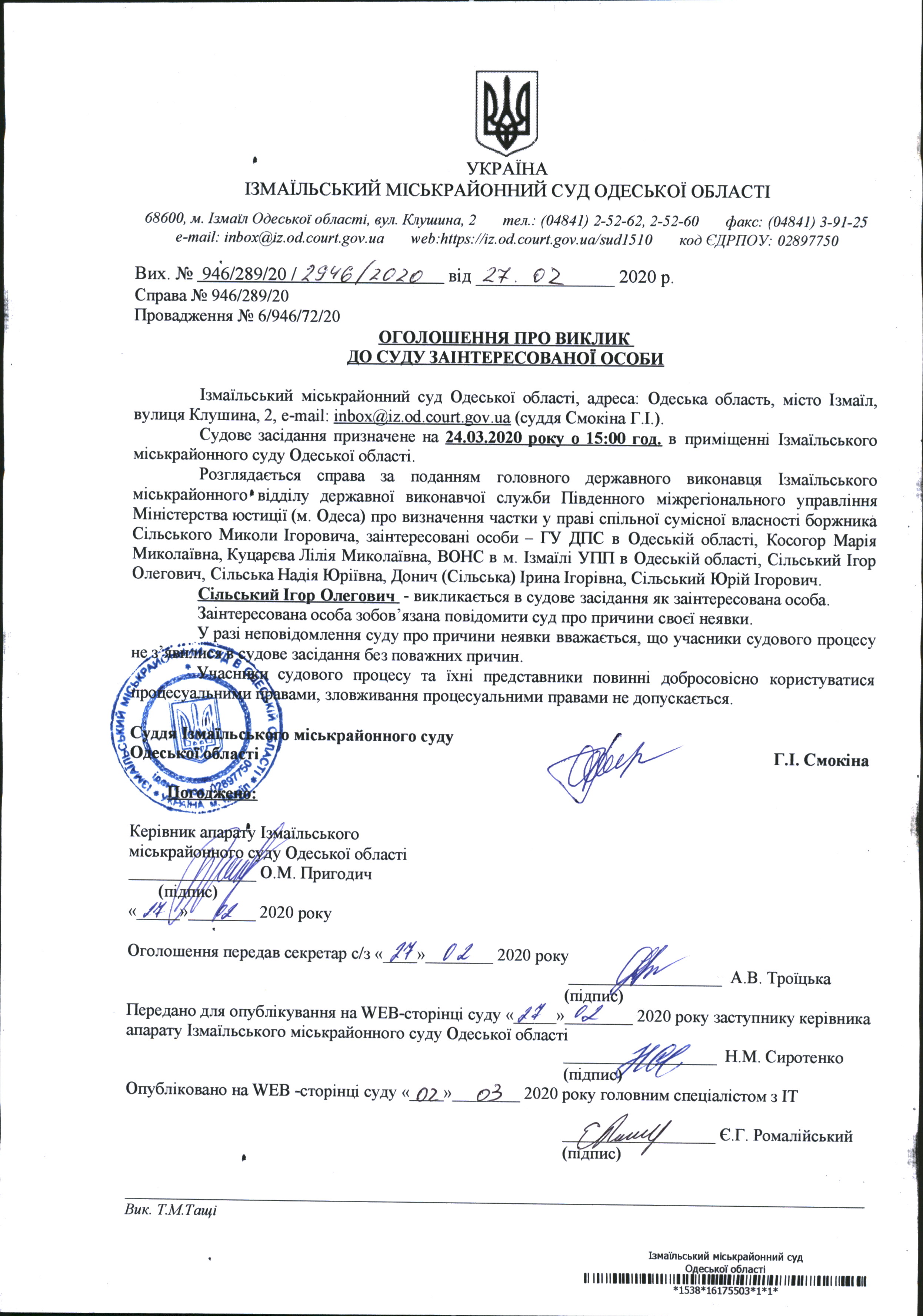 Оголошення про виклик у судове засідання Сільський І.О.