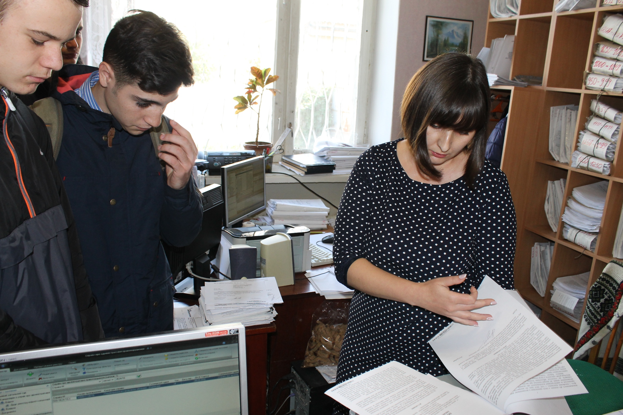 Після екскурсії всі були запрошені до зали судових засідань, де в.о керівника апарату суду – Брошкова І.Г. та судовий розпорядник – Недялков Я.І. продемонстрували роботу програми автоматизованого документообігу суду КП «Д-З» та системи відеоконференцзв’язку; секретар судового засідання Кріпакова К.Т. та помічник судді Черненко Х.М. – розповіли про свої посадові обов’язки. Учасники дуже уважно слухали та в процесі дискусії задавали питання, які їх хвилювали.