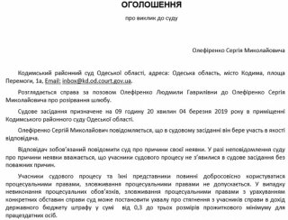 Судове засідання призначене на 09 годину 20 хвилин 04 березня 2019 року в приміщенні Кодимського районного суду Одеської області.