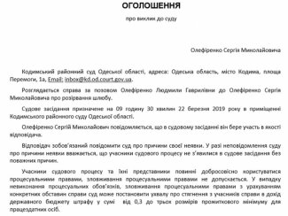 Судове засідання призначене на 09 годину 30 хвилин 22 березня 2019 року в приміщенні Кодимського районного суду Одеської області.