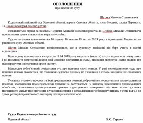 Судове засідання призначене на 10 годину 30 хвилин 19 квітня 2019 року в приміщенні Кодимського районного суду Одеської області.