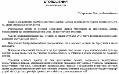 Судове засідання призначене на 11 годину 20 хвилин 30 травня 2019 року в приміщенні Кодимського районного суду Одеської області.