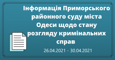 Так, з 26 по 30 квітня 2021 року включно в Приморському районному суді м. Одеси було розглянуто 15 справ.