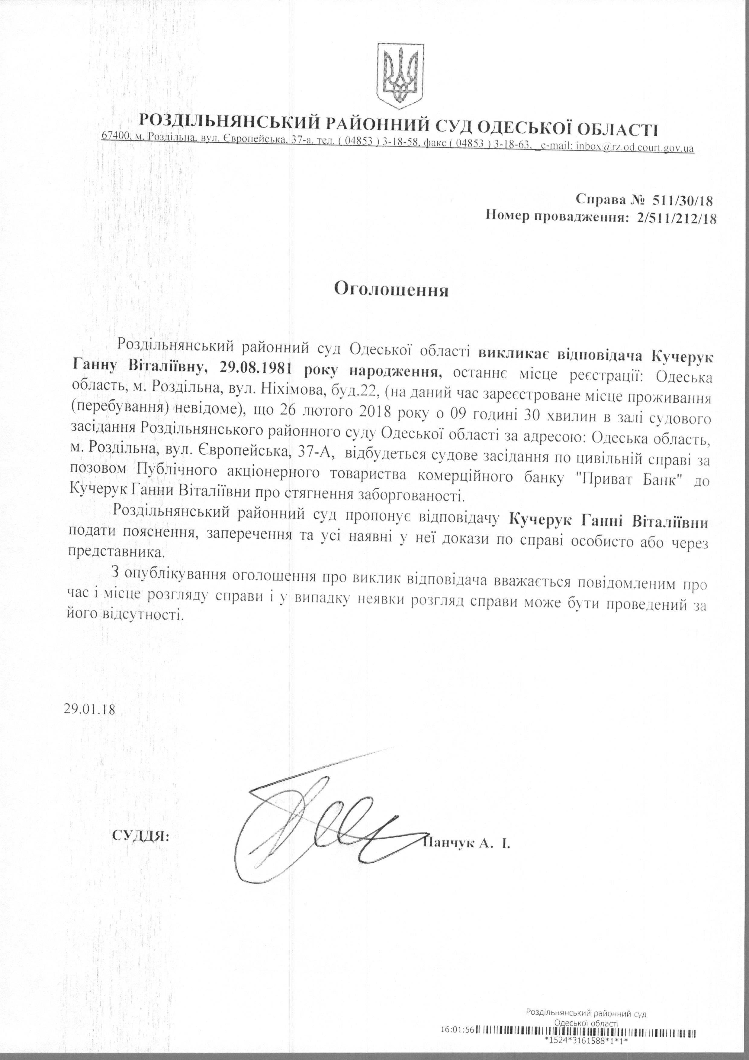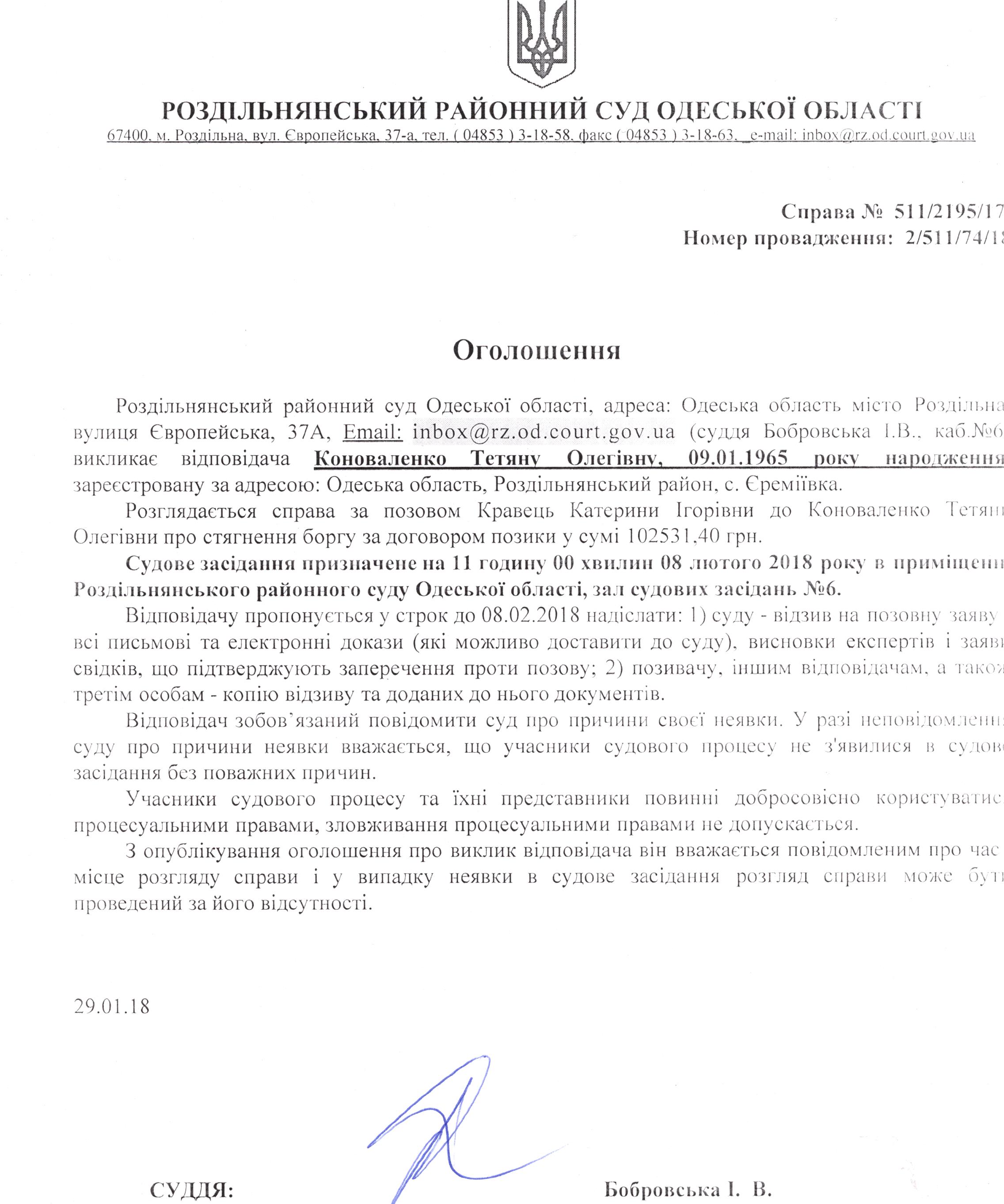 Оголошення до суду 29.01.2018
