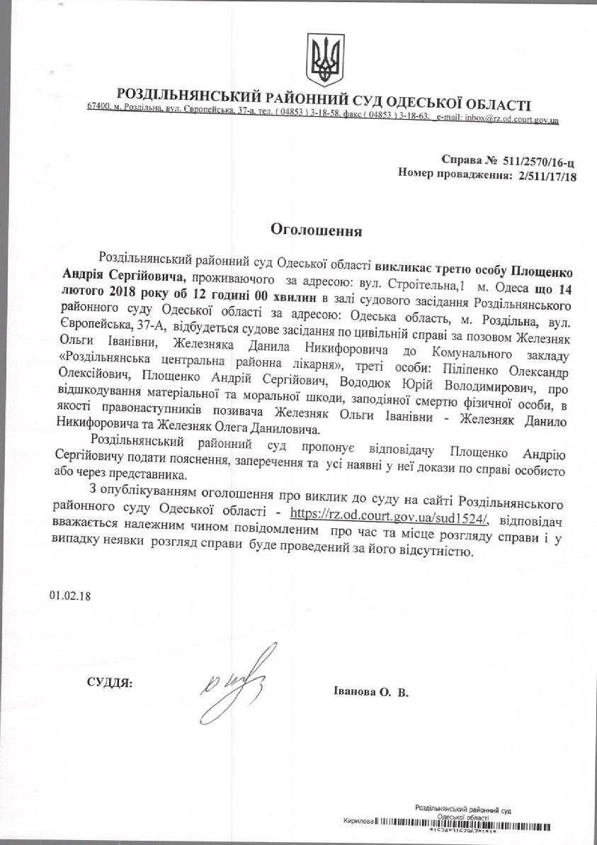 Оголошення до суду 01.02.2018