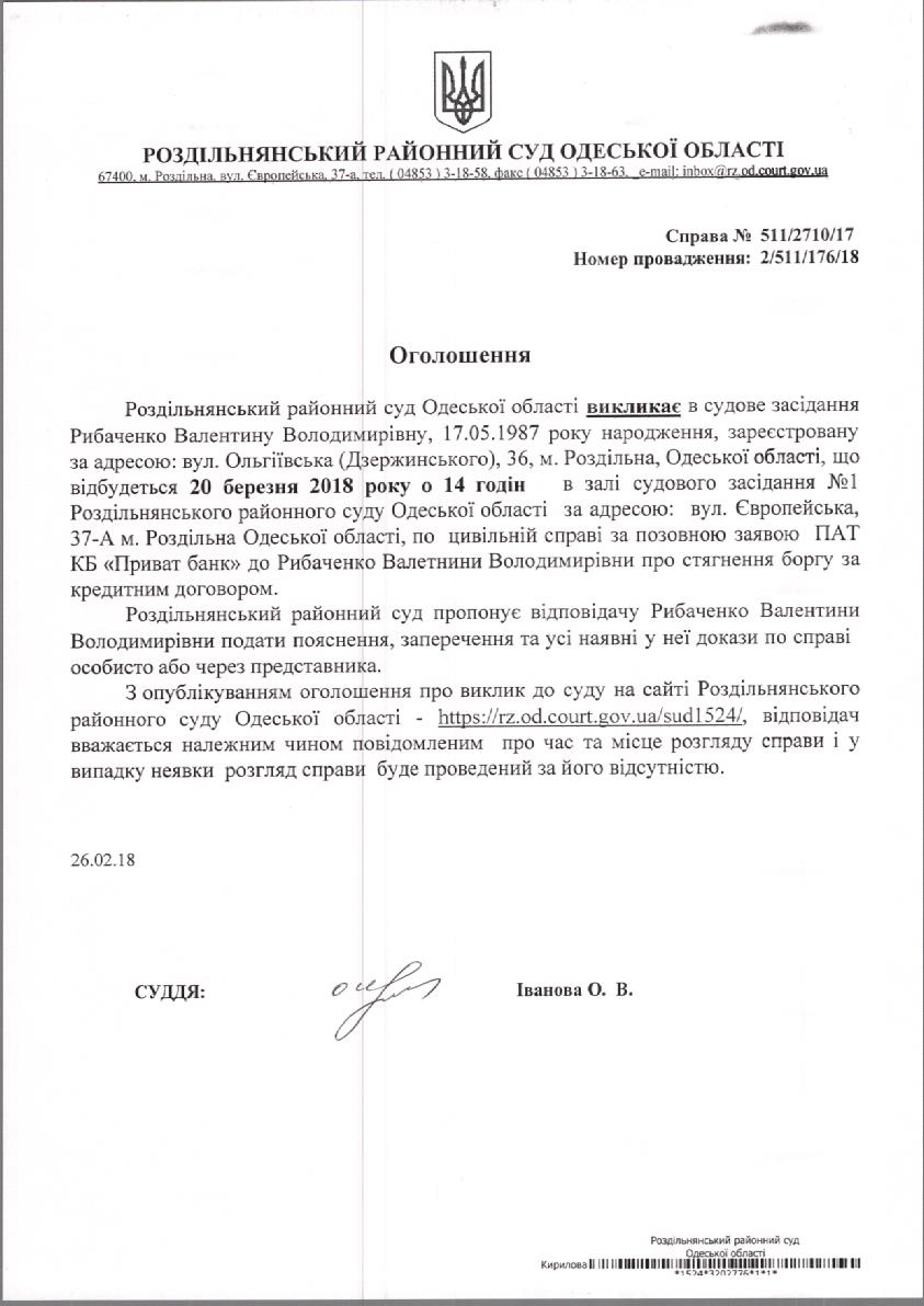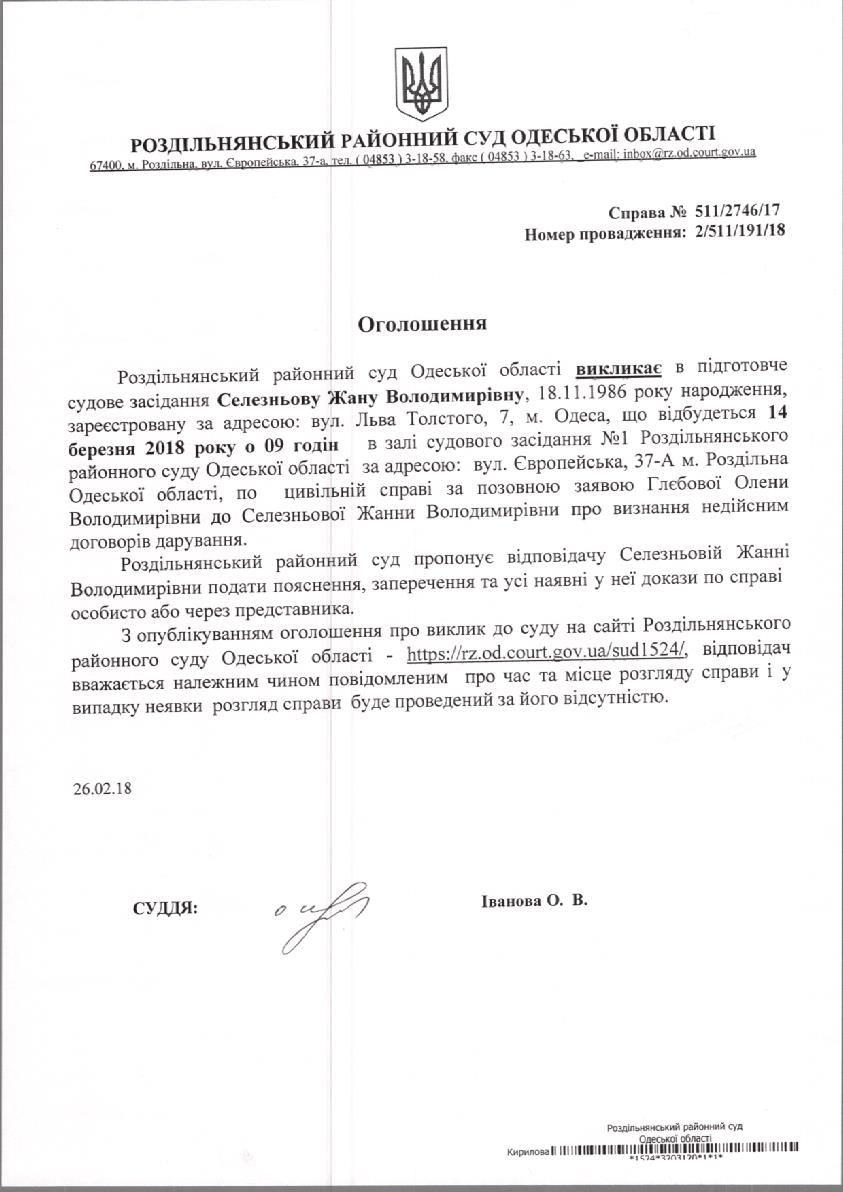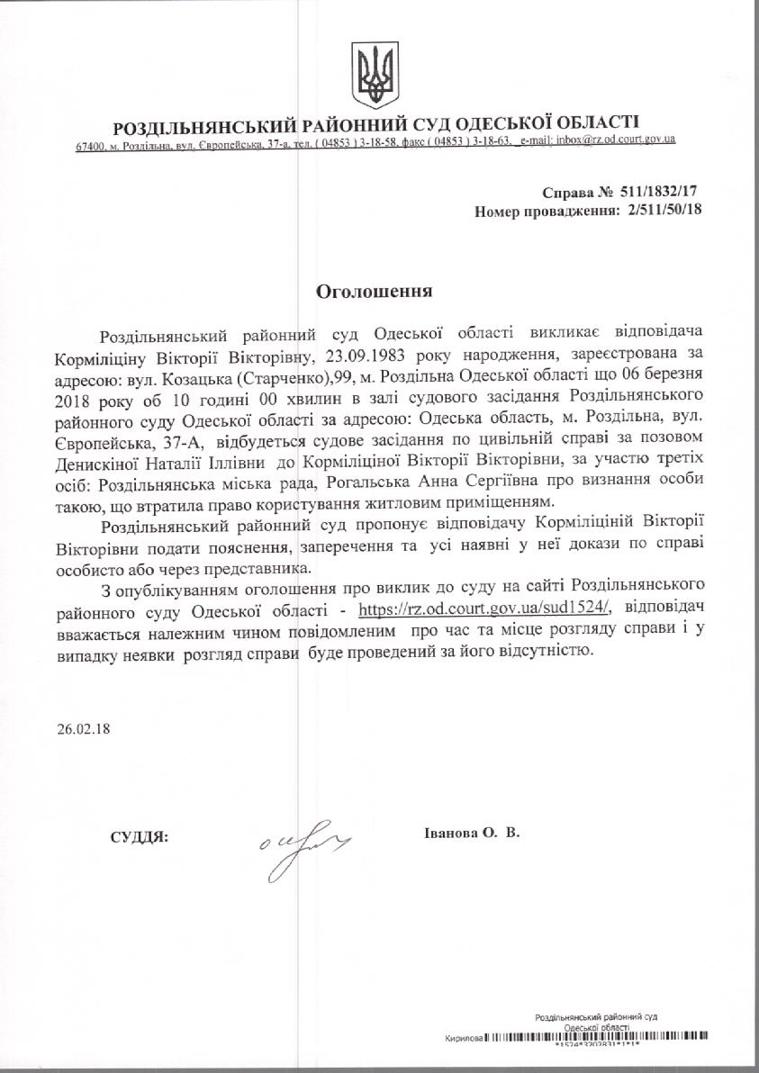 Оголошення про виклик до суду 26.02.2018